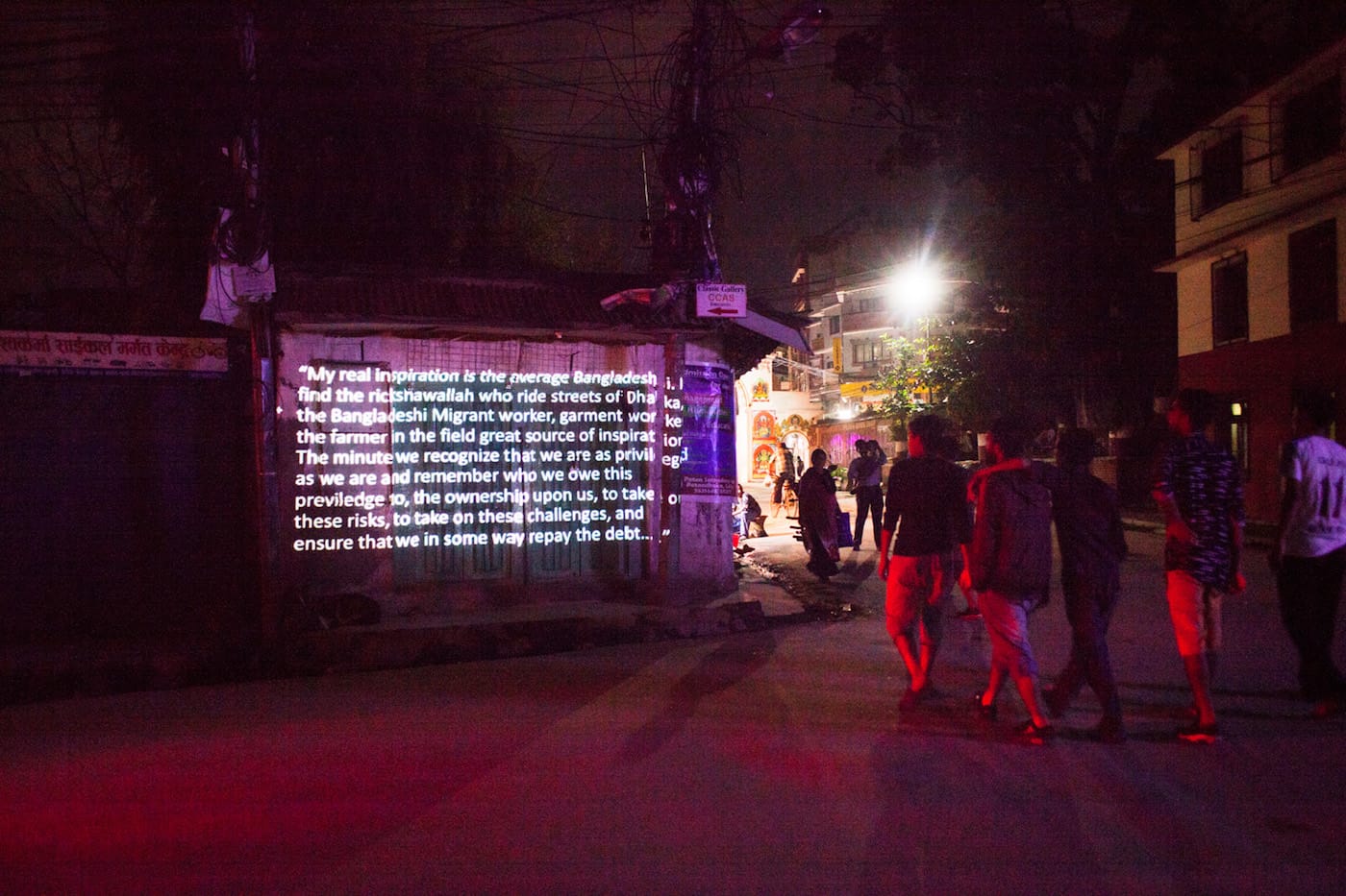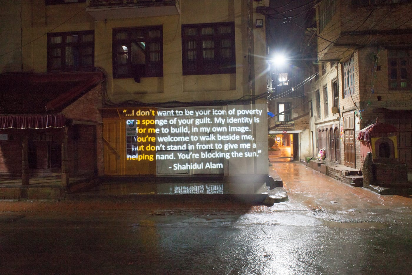 In late August, this powerful quote, by award-winning Bangladeshi photojournalist and activist Shahidul Alam, glowed on the sides of buildings throughout the streets of Kathmandu. It was part of a city-wide art installation and protest, in which the Nepali capital’s walls lit up with projections of quotes and photographs by Alam, who on August 5th was dragged from his home, detained, and jailed by Bangladeshi police. His crime? Critiquing the Bangladeshi government during an interview with Al-Jazeera about student-led protests in the country.