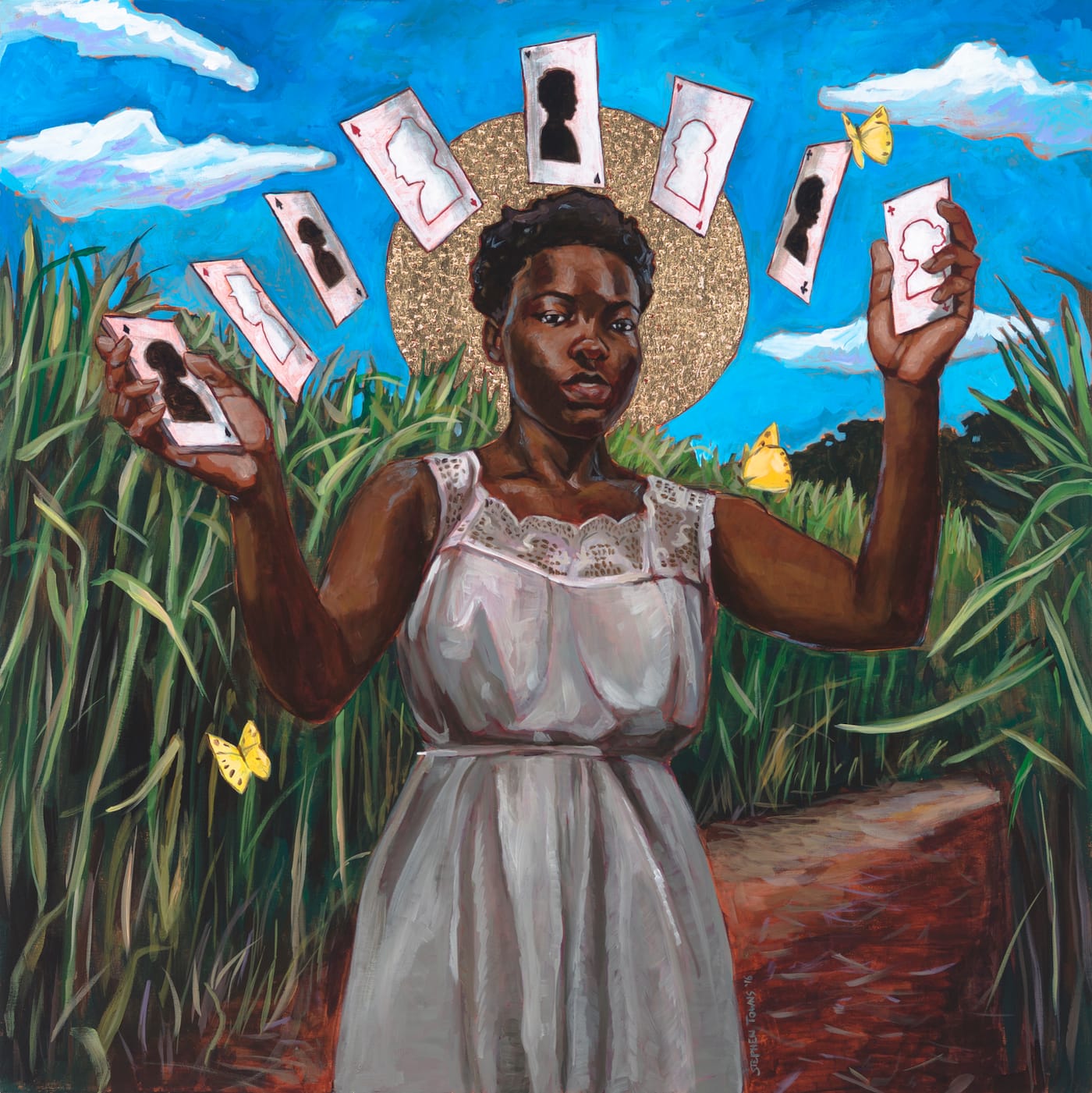 The Joy Cometh in the Morning series presents six painted figures, each representing a martyr from the rebellion — individuals who made a choice to wage war for their freedom for personal and spiritual reasons, knowing that their chances for success or survival were zero. In Towns’s vision, each wears a noose around their necks, held in place by one raised fist, a gesture of black power. In this pose, the artist empowers each individual to be seen as master of their own destiny, to be read as tragic heroes, and to command respect and admiration in the face of sacrifice.