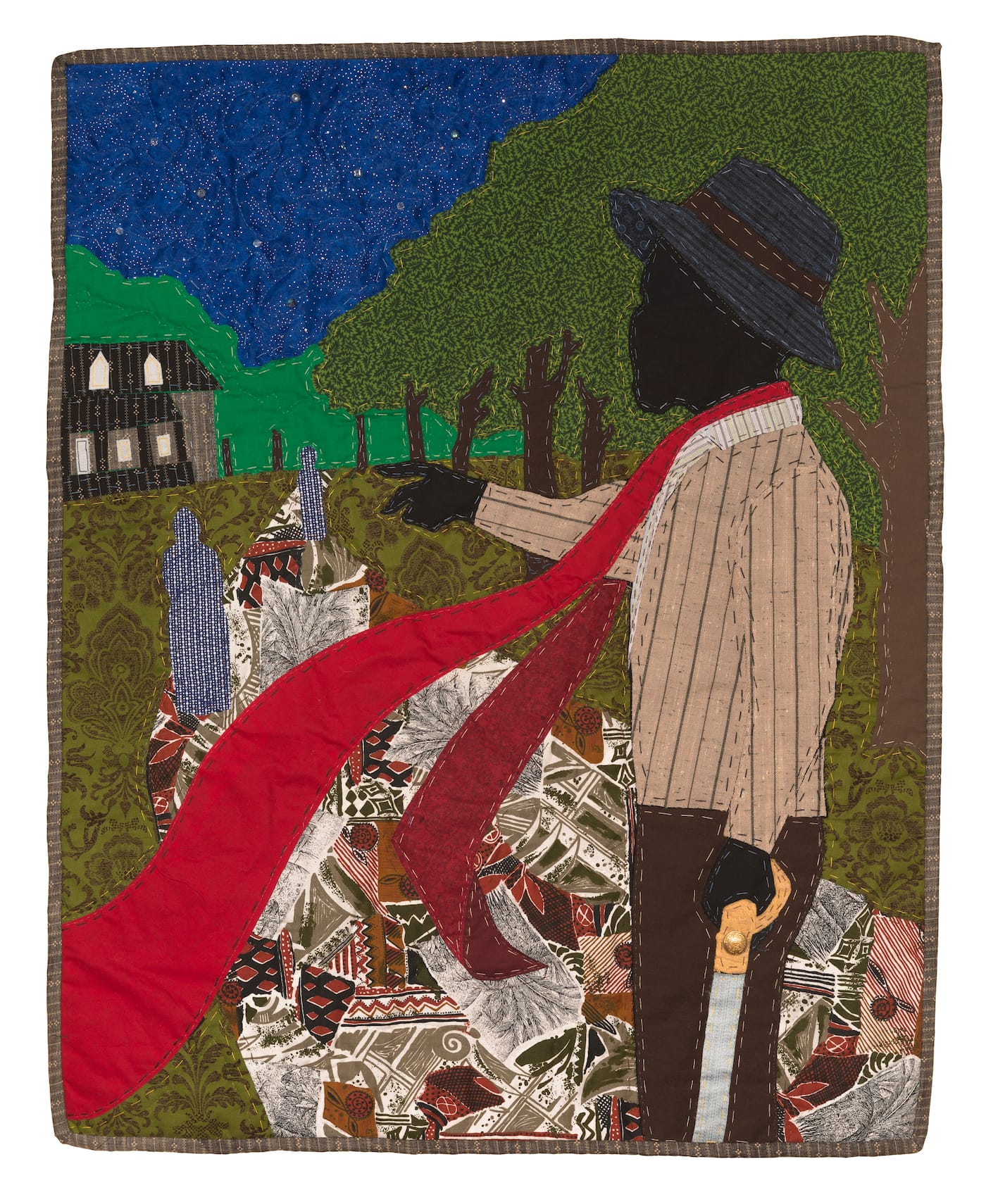 The front gallery space was filled with the artist’s magnificent quilts, which imagined different vignettes from Turner’s life, humanizing him and avoiding depictions of violence. These works are powerful because of the comfort they offer through their harmonious arrangement of patterned fabric and domestic familiarity, with figures rendered as silhouettes. Each quilt allows the viewer to grow emotionally attached to it before realizing the violence and controversy, the inherent feelings of conflict and remorse that Turner’s story brings.