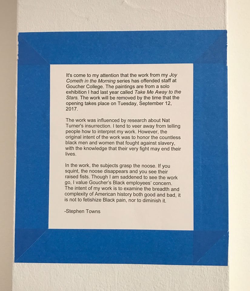 “It has come to my attention that the work from my Joy Cometh in the Morning series has offended staff at Goucher College,” says Towns in a statement placed in the gallery alongside the empty frames. “Though I am saddened to see the work go, I value Goucher’s Black employees’ concern. The intent of my work is to examine the breadth and complexity of American history, both good and bad. It is not to fetishize Black pain, nor to diminish it.”
