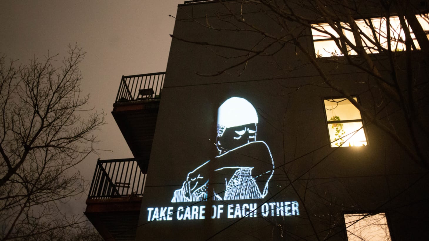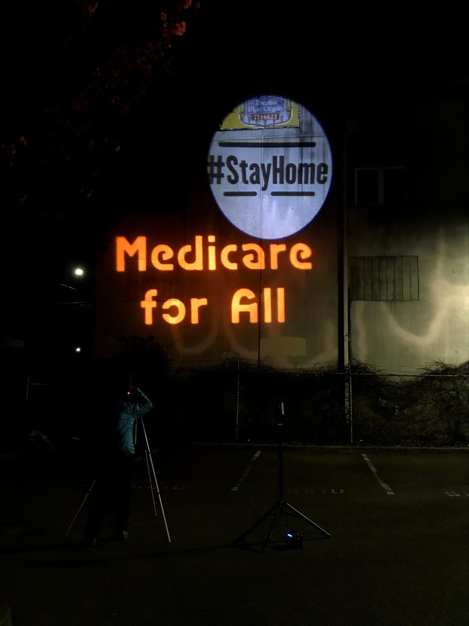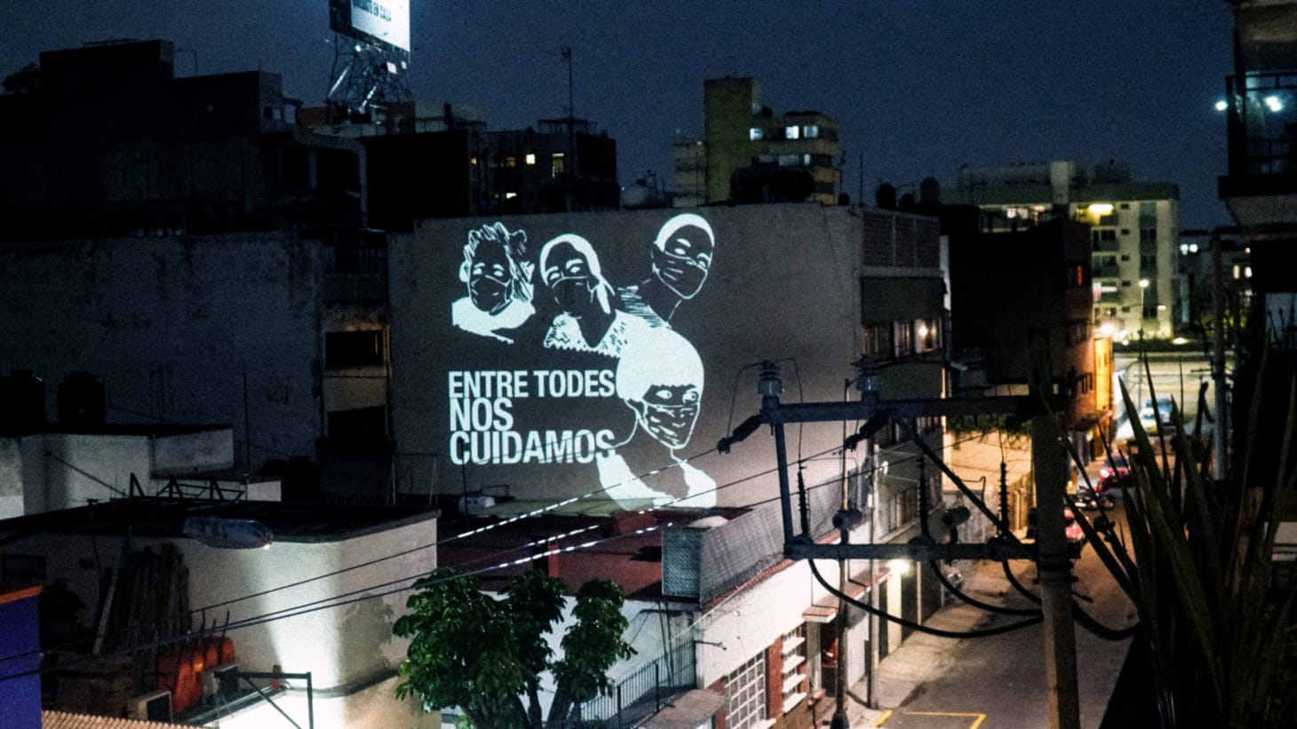 For World Health Day on April 7, Mercedes Invernizzi, Mariela Bond, and Jorge de las Morenas, three Buenos Aires-based artists who work to activate and facilitate proyectorazos, issued a call for projections that express the power of collective action in the midst of the pandemic. From Guadalajara to Portland, from Asunción to Brussels, facades lit up with graphics and messages ranging from expressions of support for health workers to demands for “Medicare for all” and the end of military spending.