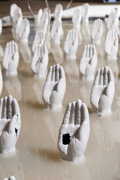 Despite the multimedia work in Holy River, Nourry roots her work in sculpture. She strives to transcend flatness in her two dimensional work, often projecting videos on ashes, liquid or a studio floor and refilming them in a new textured form. She also celebrates the process of sculpture, and has ceramic shells of her clay pieces being readied for bronze. This reverence for creation is further explored in her performances, and at the Invisible Dog we find the caked mud remains of a dance performance, where microphones were placed in the mud and clay. Everywhere in Holy River are splayed or reaching hands grasping for touch, or creation, and there is something tactile in every piece.