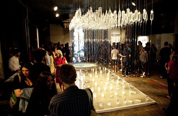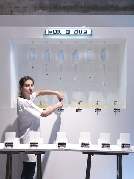 A drinking station under the sign “Eau de Vie” (water of life) in Holy River has six different choices of tap water flavored with sweet tastes by Michael Hamilton, each representing a river, which visitors can sample out of test tubes. Nourry experimented with a similar idea in her “Spermbar” project in 2011, which was the result of her shock and fascination with the American sperm-bank industry. She had symbolic sperm donors fill out their traits, and then associated these traits with ingredients for genetic cocktails, which she served out of a food truck on Fifth Avenue.