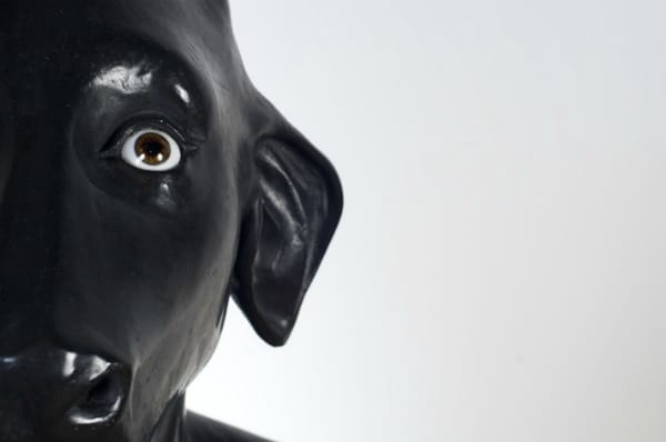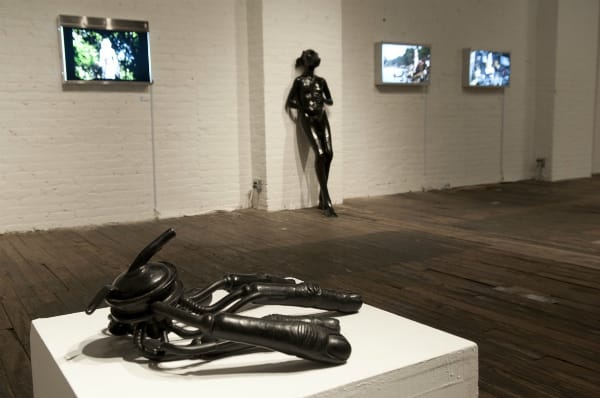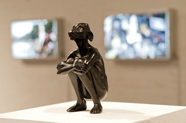 A towering lightbox of a goddess with the head of a cow shines over the reflecting pool of clay hands, and the figure is repeated throughout the exhibit, one striding Giacometti-like and others crouched, their ears pulled back timidly. The hybrid figure is something Nourry imagined, playing off the prevalence of hybrid gods in India, and contrasting a revered animal symbol of fertility with the less honored female herself. Communicating sensitively to peoples’ values in India was immensely important to Nourry in her work, as well as creating a goddess who would be accepted with the others. The lightbox photographs are of an 18-foot tall version of the goddess from when Nourry infiltrated the Durga festival in Kolkata in 2011, where giant versions of gods and goddesses are sculpted from mud from the Ganges river, then pushed back into the water from the river banks. A set of stairs behind the lightbox allow visitors to look through the paraded goddesses eyes (the eyes of a sculpture are said to give it a soul), and several photographs and a video chronicle the fascinating realization of the goddess. In another project in 2010, she left resin versions of the hybrid sculpture in the streets, where she documented reactions to this strange, yet familiar, creature.