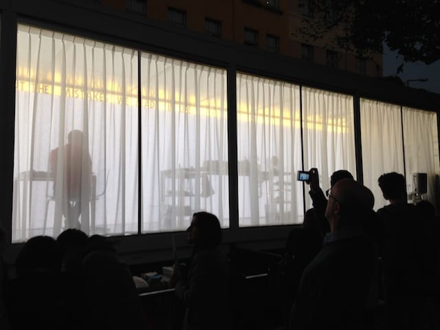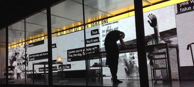 When I visited the installation today, there were no projections in the glass container. The artist sat alone, behind a transparent gossamer curtain. He was talking on his cell phone, his back to the audience. A pane of glass had been shattered where one viewer had thrown a rock into it. Perhaps the weight of his mistake has finally set in for Verhoeven.