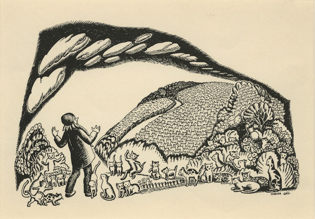 The oldest American picture book still in print, Wanda Gág's Millions of Cats (1928), featuring illustrations and cover art by Gág and hand-lettered text by her brother, is now free for millions of Americans to use as they wish. Having won the 1929 Newbery Medal, Gág's double-page spread depicts a tender but slightly disturbing tale of a lonely elderly couple's desire and decision to choose the perfect cat to share their love with, only to find that they're spoiled for choice.