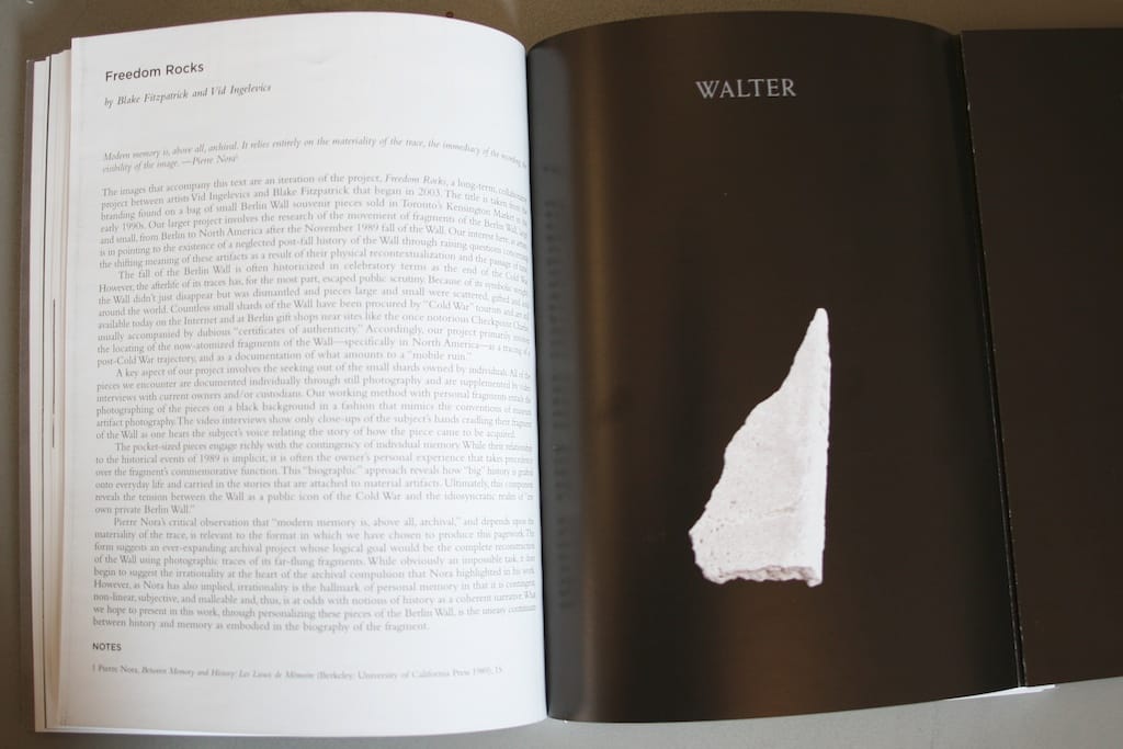 Blake Fitzpatrick and Vid Ingelevics’s “Freedom Rocks” is about the building blocks of a historical narrative, almost literally. The pair seek out individuals that own fragments of the Berlin Wall, photograph the fragments against a black background, and video tape interviews with the rocks’ owners describing the process by which they came to own pieces of the Wall. The fragments become synecdochal of the greater history of the city and the German nation. By documenting individual stories, Fitzpatrick and Ingelevics write, they reveal “how “big” history is grafted onto everyday life and carried int he stories that are attached to material artifacts.” It’s an intensely poetic, heavy project that is heightened by the museum-style artifact photographs of the fragments themselves.