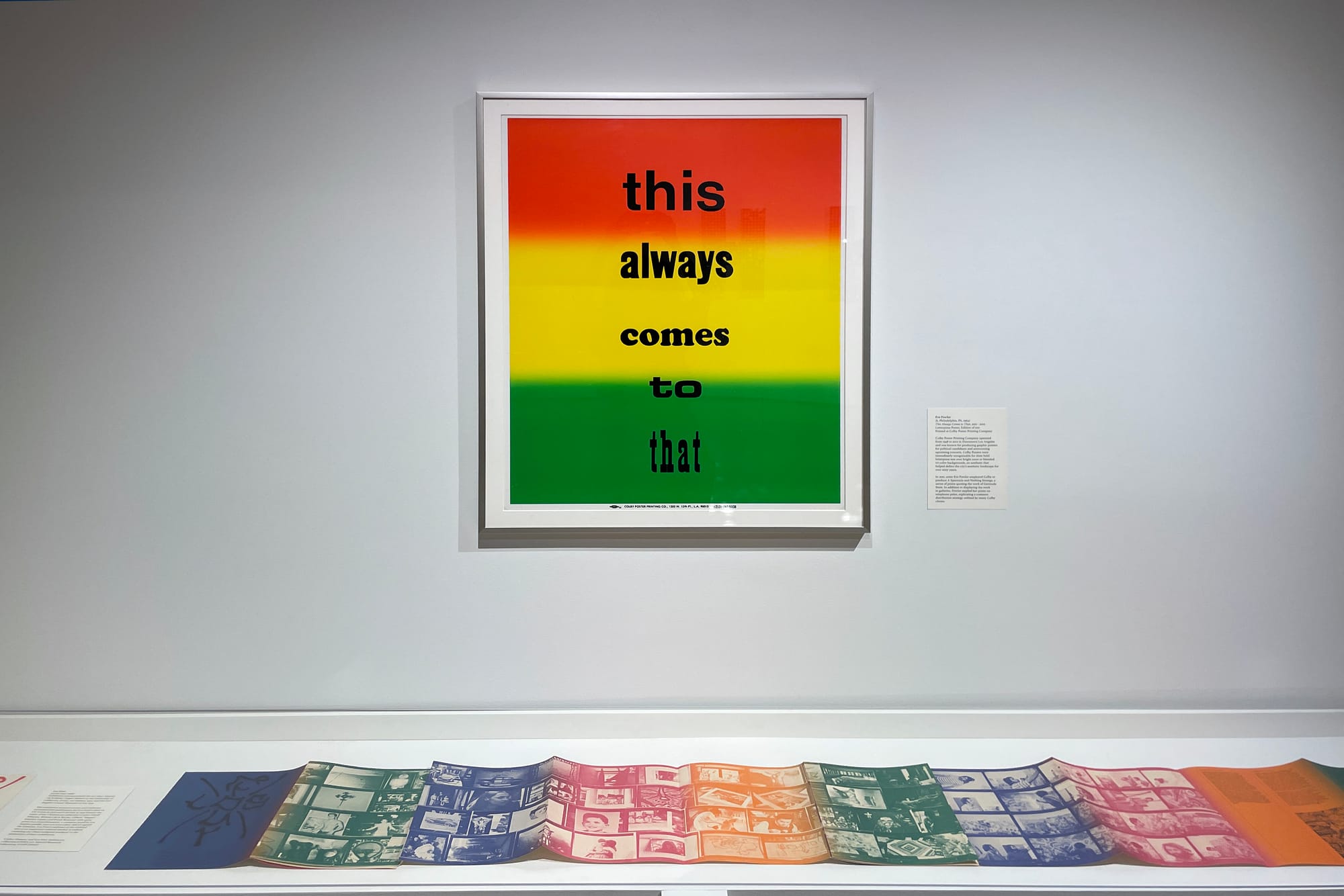 The historical works show that California has been a silkscreen and sign-painting hotspot since the mid-20th century. There’s a vitrine dedicated to the Colby Poster Company, which advertised bachata dance nights and underground raves on fluorescent gradient backgrounds. Lukas juxtaposes these pieces with contemporary works that adopt these techniques. Eve Fowler’s “This Always comes to That” (2011–12), for instance, pops off a red, yellow, and green Colby gradient.