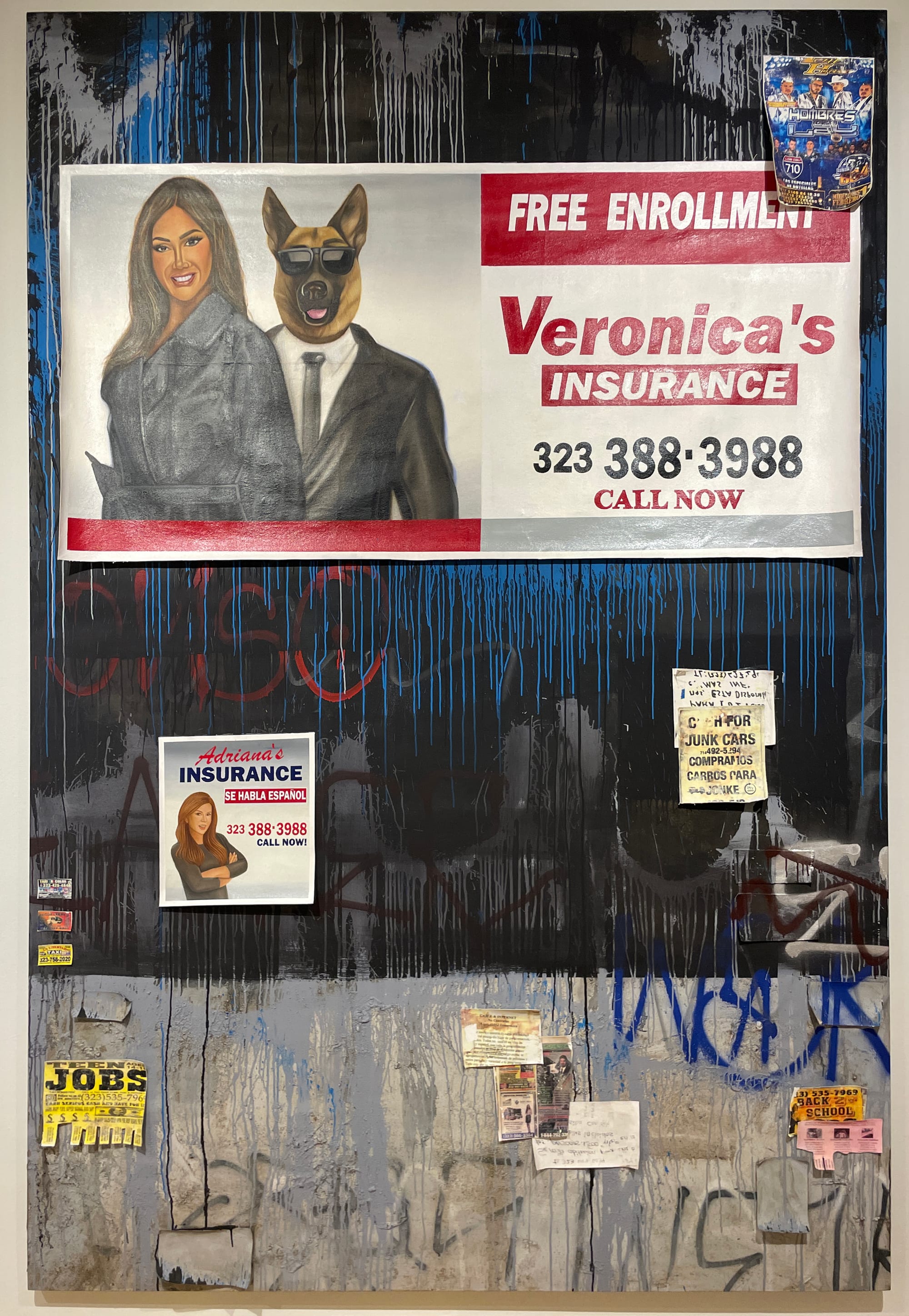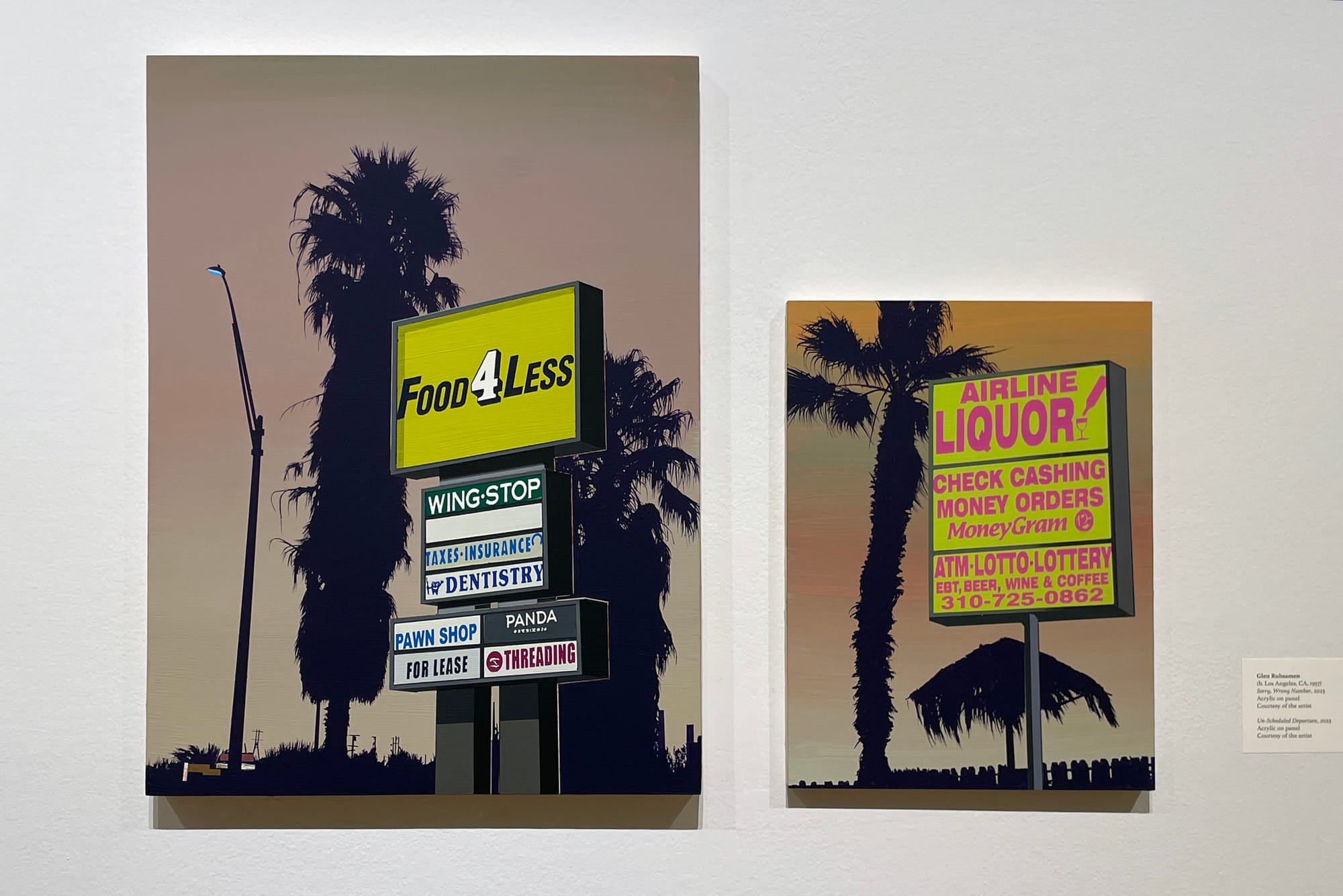 California’s language is also mundane. In “Injured?: I” (2024), Gonzalez Jr. uses oil paint to reproduce the phone numbers and portraits of the spokespeople from Los Angeles’s ubiquitous insurance billboards. Glen Rubsamen turns to strip malls, depicting a glowing “Food 4 Less” sign among a smoggy sky in “Sorry, Wrong Number” (2023). Streaks of orange vibrate just underneath the surface, giving the painting a smoldering effect.