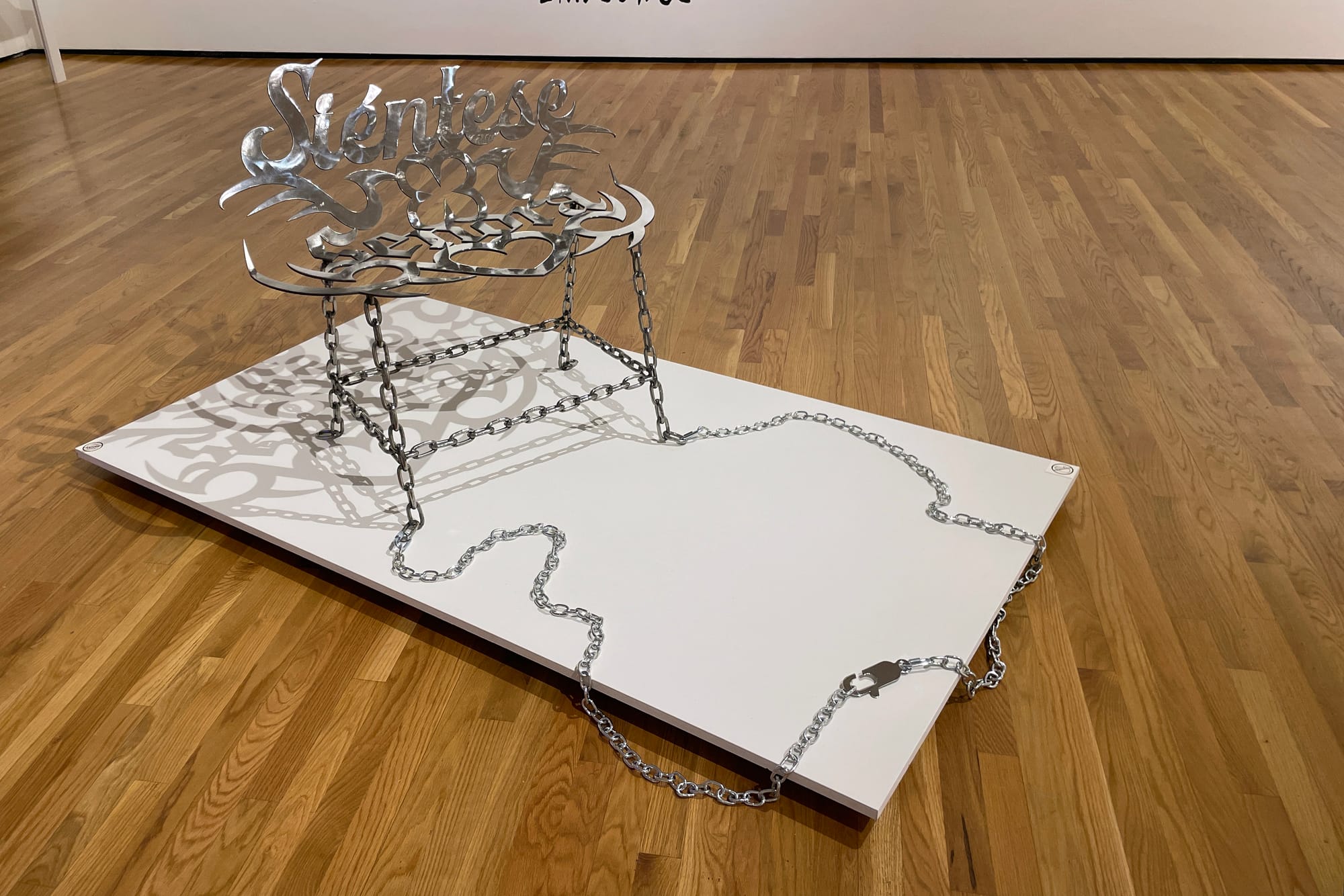 Public Texts is not just a showcase of 2D works, however. It demonstrates that sculpture can also be a text-based medium through Georgina Treviño’s piece, “Siéntese Señora” (2024). She reworks the titular phrase into the tight, pointed angles of a blackletter font in a sculpture that recalls both a bench and a nameplate necklace, a common fashion accessory in Chicana culture. The legs form chains, which curl along a white plinth, eventually connecting through a clasp.