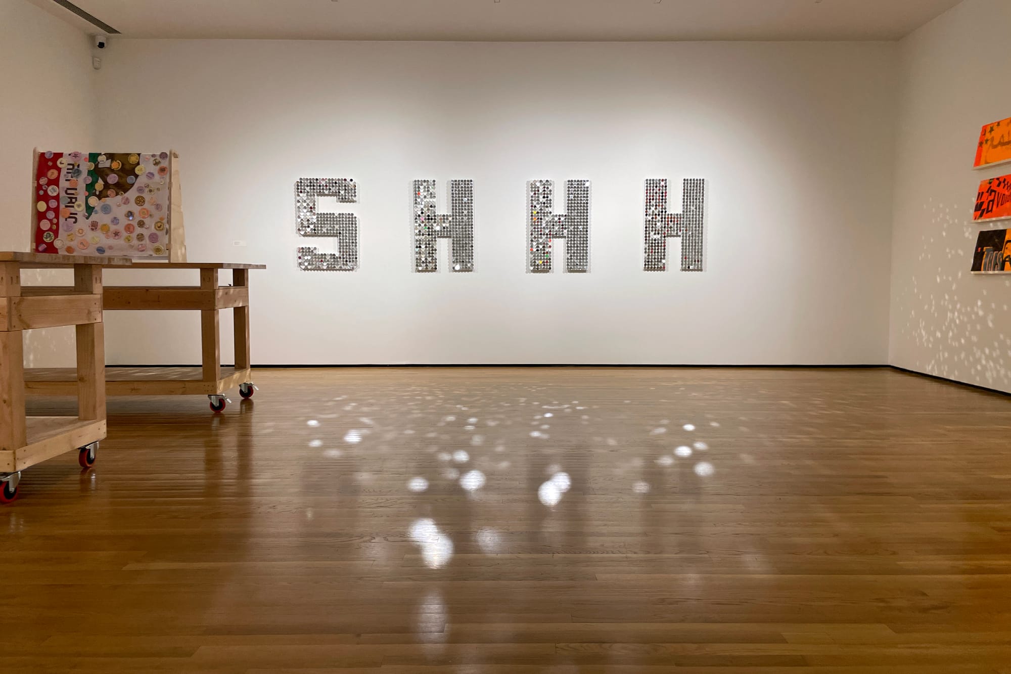 As the exhibition progresses, the size of its works grows. In the second gallery, Ana Teresa Fernández’s work “SHHH” (2023), made up of hundreds of small acrylic mirrors, casts reflections like a disco ball. Whereas the exhibition began nearly empty, this part of the show includes a collection of risograph buttons and shelving that holds skewed texts on bright orange paper. These are class projects that students at the college made using the exhibition as inspiration. Their inclusion is a clever way of tying in a new generation into the show’s thesis — and a foreshadowing of an emergent new slang in art and language.