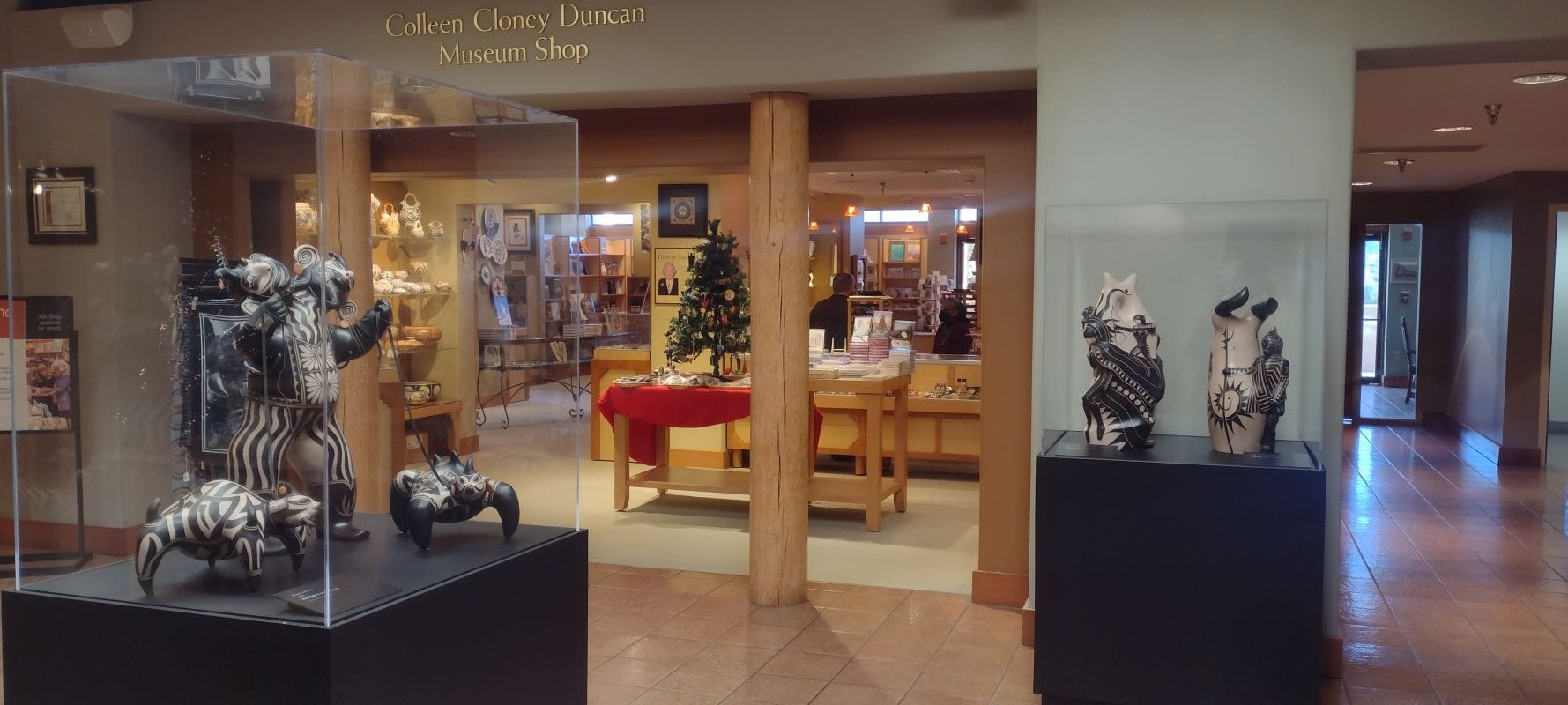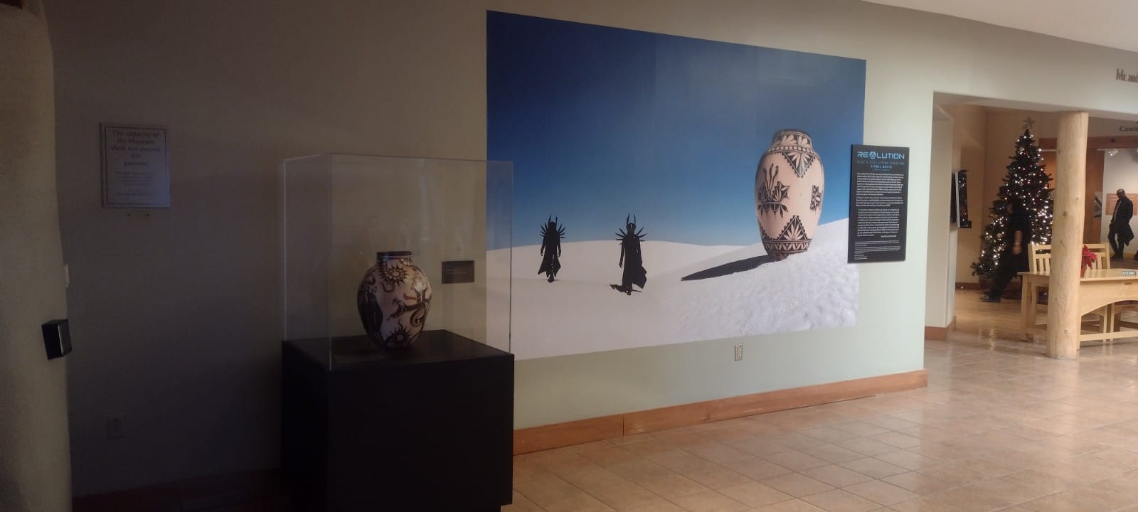 In Grounded in Clay, I watched videos of contemporary Pueblo potters interact with ancestral pots currently archived in the collections of the School for Advanced Research. I was struck by the quiet moments, as these artists moved their hands on the pot’s body, often halting on a repaired line, running their finger over and over the same spot. Something was happening, a communication in the haptic encounter that isn’t for me to know precisely, but witnessing the motion was enough. In this sense, ReVOlution functioned as a corridor or opening to learning about the other artists and times, to really seeing these works, some of which were made by Ortiz’s relatives. Perhaps this is just the reading I need to impose — to turn a lobby exhibition into the metaphor of a corridor, a space of transition into another way of seeing and learning. But Ortiz is a committed teacher to those willing to listen.