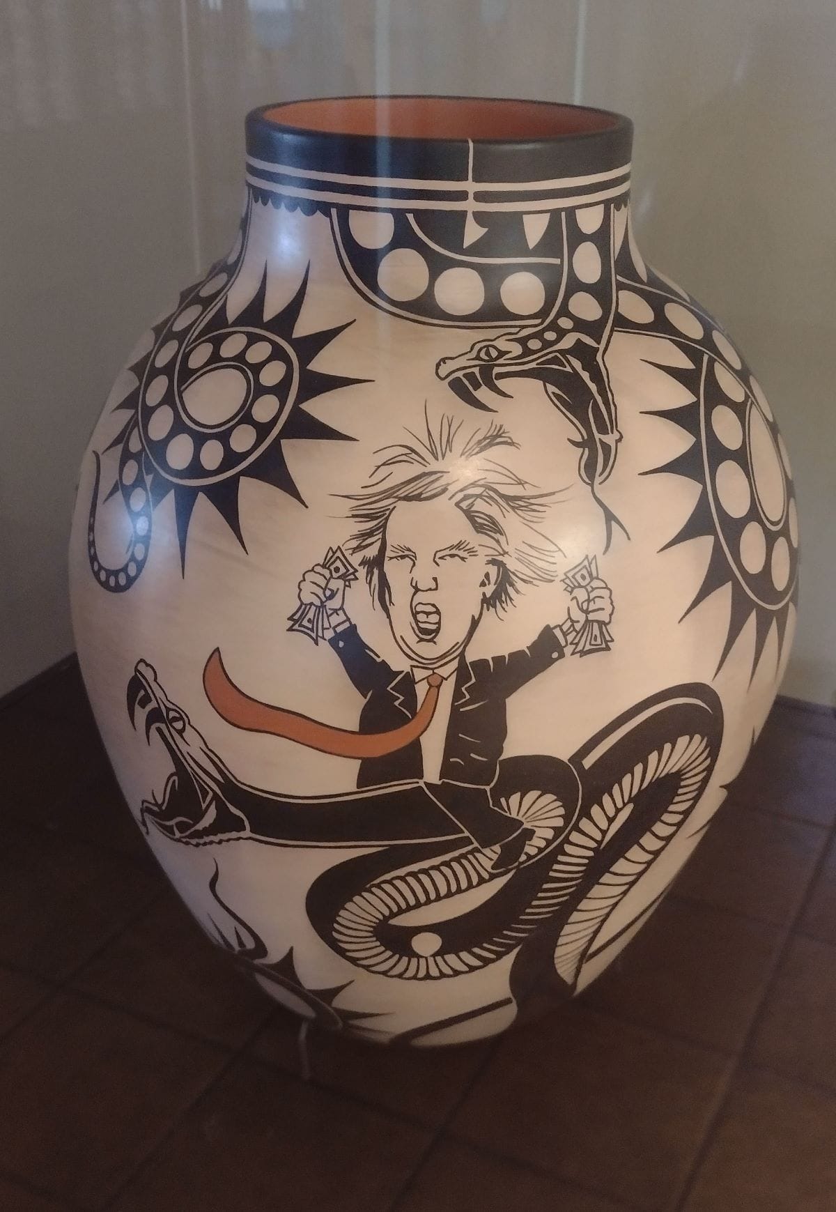 Three of the vessels featured in the show, along with one canteen by Ortiz in MIAC’s permanent exhibition, Here, Now and Always, are in glass cases with one side obstructed. In the lobby, two of the cases are positioned against walls, so I had to crane and contort myself between the case and the wall to see the full image. But Trump rides the snake; he sneers with fists full of dollars, and wears a long red tie that curls like a snake’s tongue.