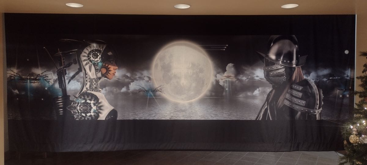 The clay speaks stories too — old, ongoing, future, and the blur of these temporal distinctions that my language has imposed. With “Blind Archers” (2019) and “Venutian Soldier Quest” (2020), the final two ceramic pieces in the show, Ortiz grafts figures to vessels, a technique that demonstrates his remarkable co-innovations with clay. They also comprise stories from Ortiz’s elaborate worlding that enfolds the 1680 Pueblo Revolt with an imagined 2180 into a chiasmus of resistance, resilience, shifting and innovating forms — all eternal characteristics of Pueblo people and lands. The Blind Archers figured in the pot along with Tahu, who is projected into a large-scale photographic banner, “Face Off: Tahu and Castilian 2180” (2015), orient the viewer to some of Ortiz’s main characters. Tahu, a Keres term of respect for elder Pueblo women, was blinded by a conquistador during an archery contest. She becomes the leader of the Blind Archers in Ortiz’s enduring Pueblo Revolt.