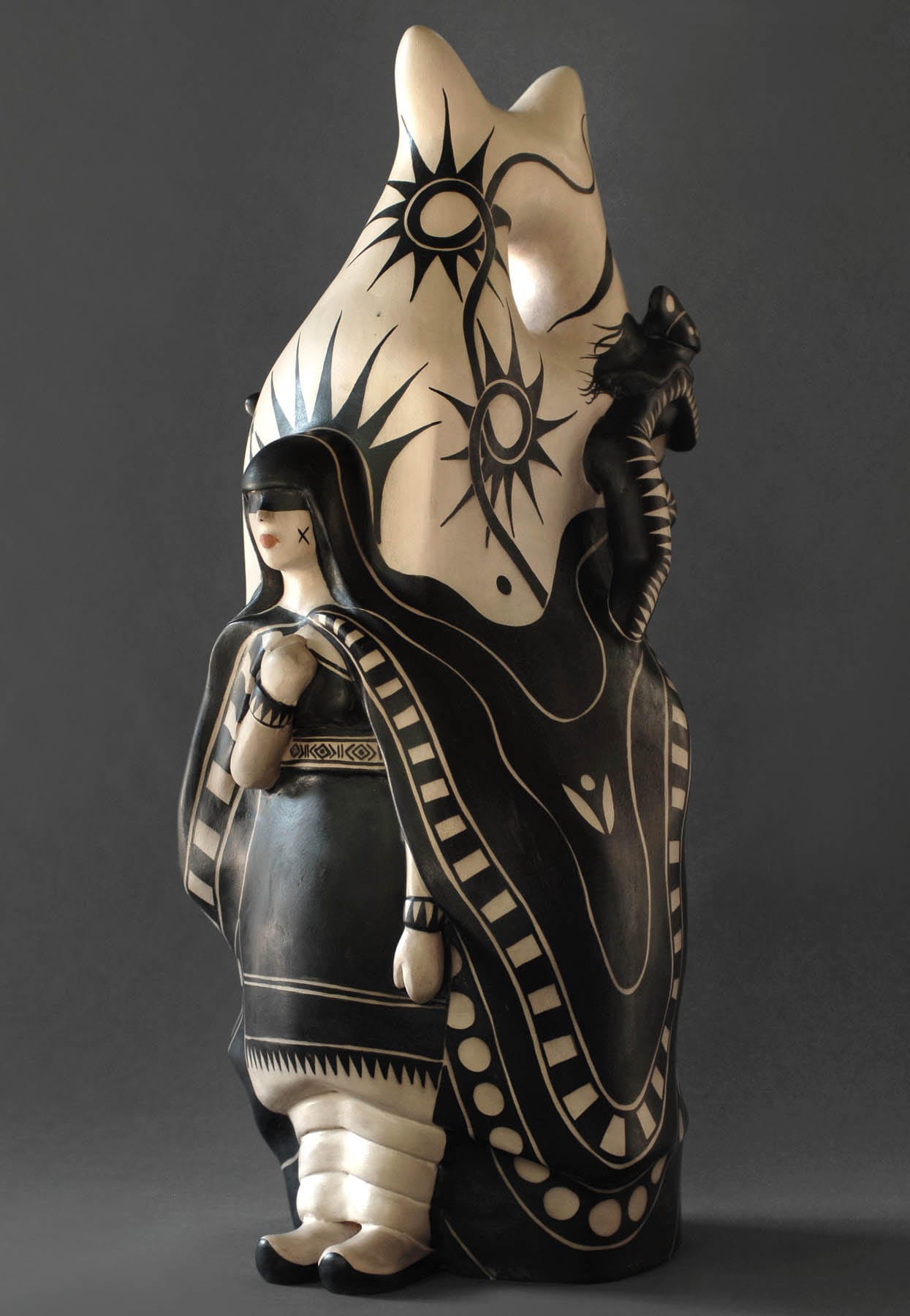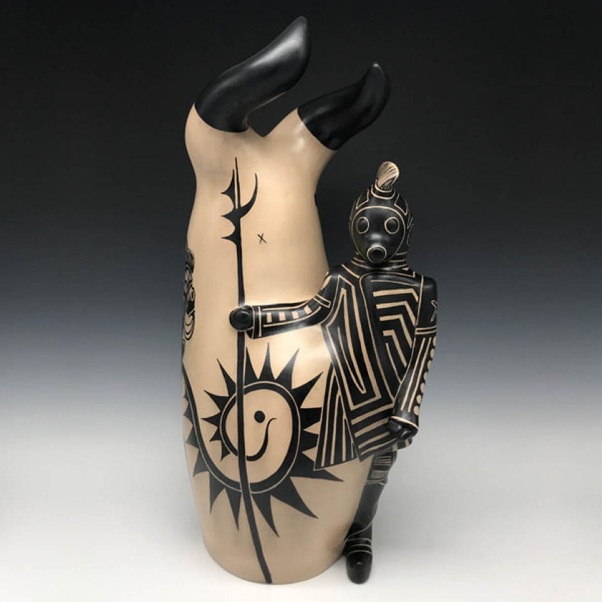 Ortiz’s mother, Seferina Herrera, and grandmother, Laurencita Herrera, were both prolific potters who carried Cochiti traditions forward, making vessels from their land’s clay, painted with black designs from harvested wild spinach — techniques that Ortiz has always used himself. He made his first clay figure when he was six, a storyteller in the style of his grandmother’s and mother’s designs, featuring a woman wearing a suit with a bow tie. Gender play, kink, and futures that touch traditional lifeways are enduring features of Ortiz's work.