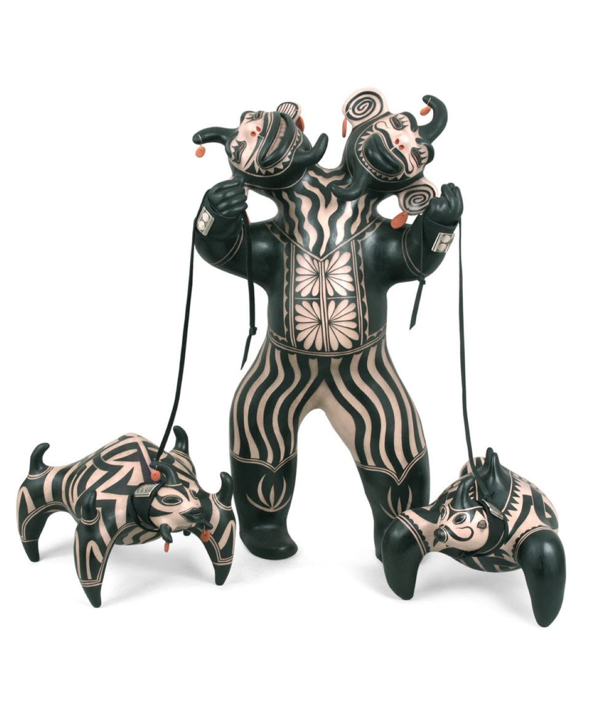 “Master and Tics” (2020) includes Monos figures, reminiscent of those created by Cochiti potters from about 1880–1920 to represent and comment on an influx of outsiders to the pueblo, brought by train. The Monos, which means “to mimic,” staged parodic figures in motion, performing, commanding attention — Spanish, New Mexican, or Euro-American circus performers, land thieves, and priests. Potters sold their Monos figures to the very outsiders they mocked, and once the audience realized they were both the target of parody and the market to consume it, Monos disappeared from circulation.