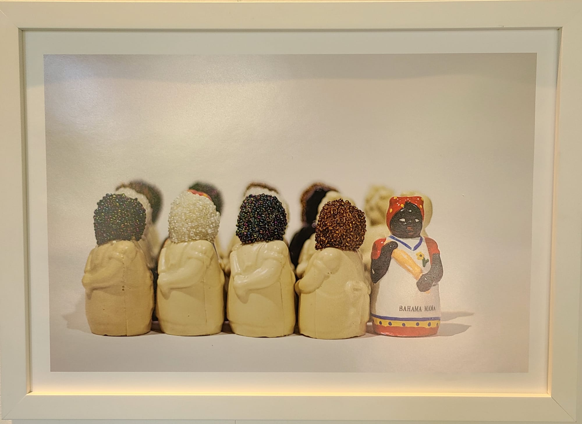 I am drawn to both Smith and Minnis, the first pair I encounter on entering the gallery (they are also paired in terms of having similar approaches to image making) because they use photographic self-representation to discuss the ways and means of Caribbean womanhood. Smith’s portraits, such as “Yellow Bird in Banana Tree” (2021), get at her ongoing struggle with being seen as exotic, beating onlookers to the punchline by exoticizing herself in costumes that exaggerate her mixed (Jamaican, Guyanese, Bahamian) identity. Minnis conversely, threatens the viewer with an outstretched rolling pin in “No” (2019), essentially conveying that the woman seen to inhabit the “mammy” figure of perpetual servitude will knock you into the middle of next week as soon as your gaze leaves her. (Actually I prefer the images that are supplementary to the show, installed on a back wall: a series of figurines all holding their rolling pins like rifles across their chests, the “Bahama Mama Army.”)
