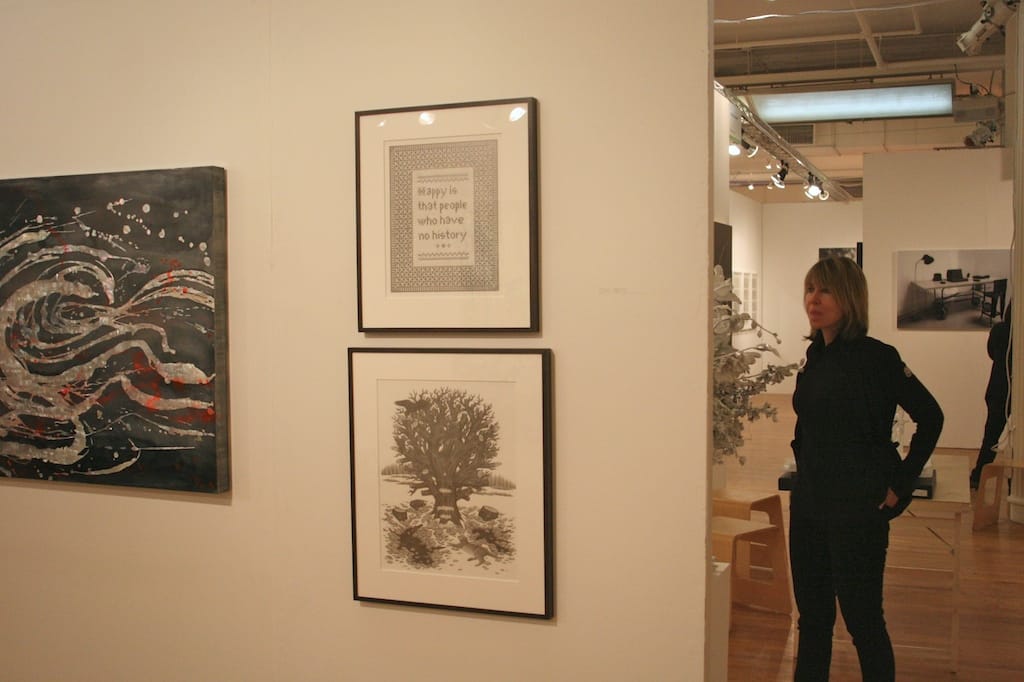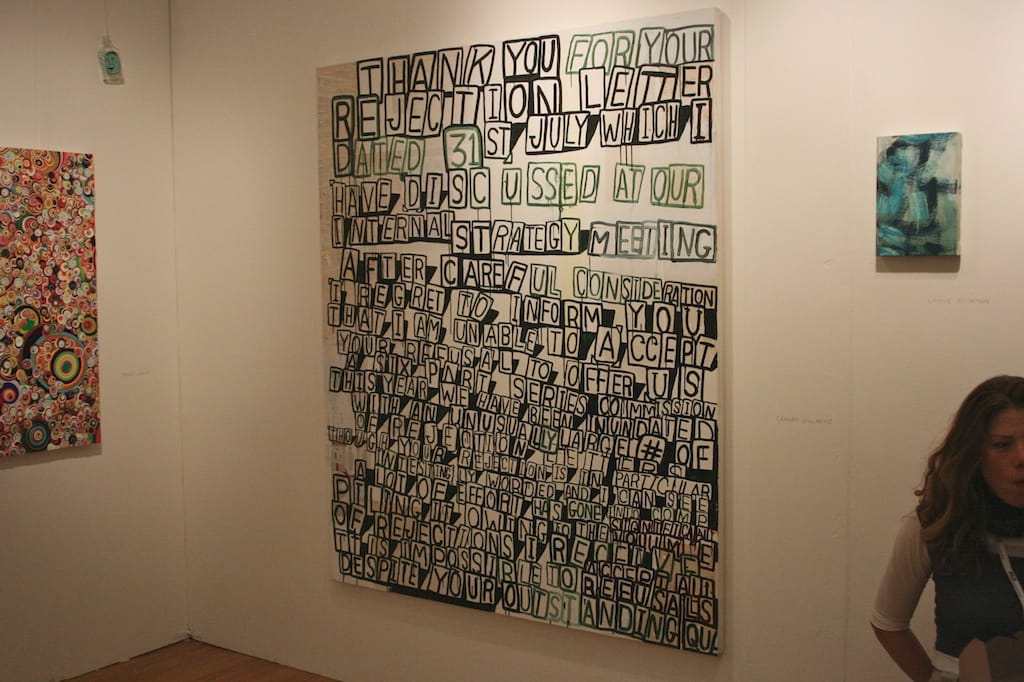 Eric Beltz writes “Happy is that people who have no history” in a patchwork pencil sampler. It’s a little reminder of the identity-less, free-floating nature of the art fairs and their attendant crowds. Political yet vague, this piece kind of hedged its bets.