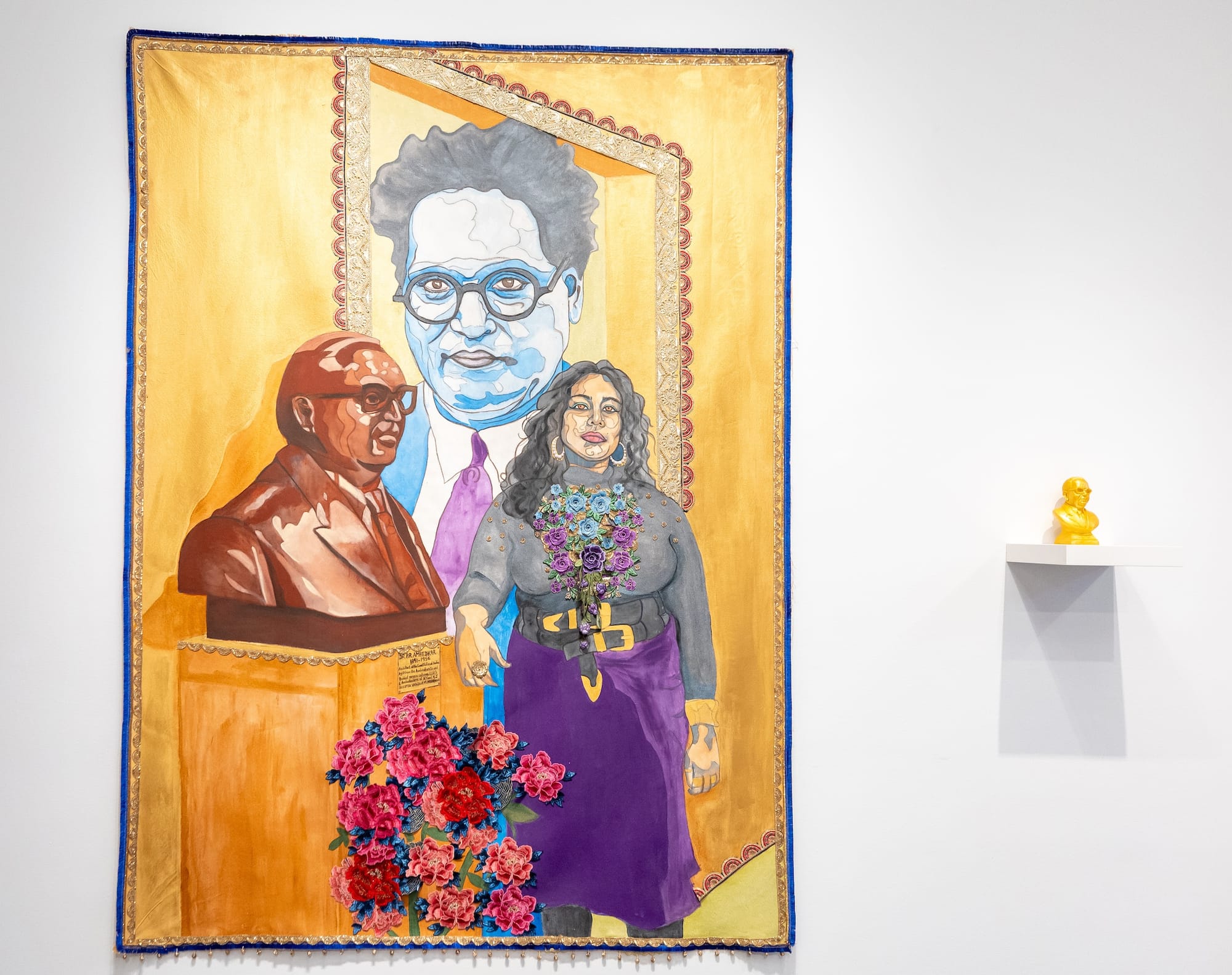 But beyond personal relationships, Talkin’ Bout a Revolution also reads like a love note to the labor of artists, writers, activists, and organizers in Azaadi’s expansive orbit. Paintings and photographs tease out their work and offer commentary on the complicated nuances of a community that continues to struggle with visibility for those at the margins of caste, class, and belonging — subjects that Azaadi has never been afraid to tackle, even if it meant less mainstream and market-oriented opportunities. One is the wall-sized painting in which Azaadi shows me standing next to a bust of Dalit civil rights icon Dr. B.R. Ambedkar, as a younger version of him at around my age looks over us.