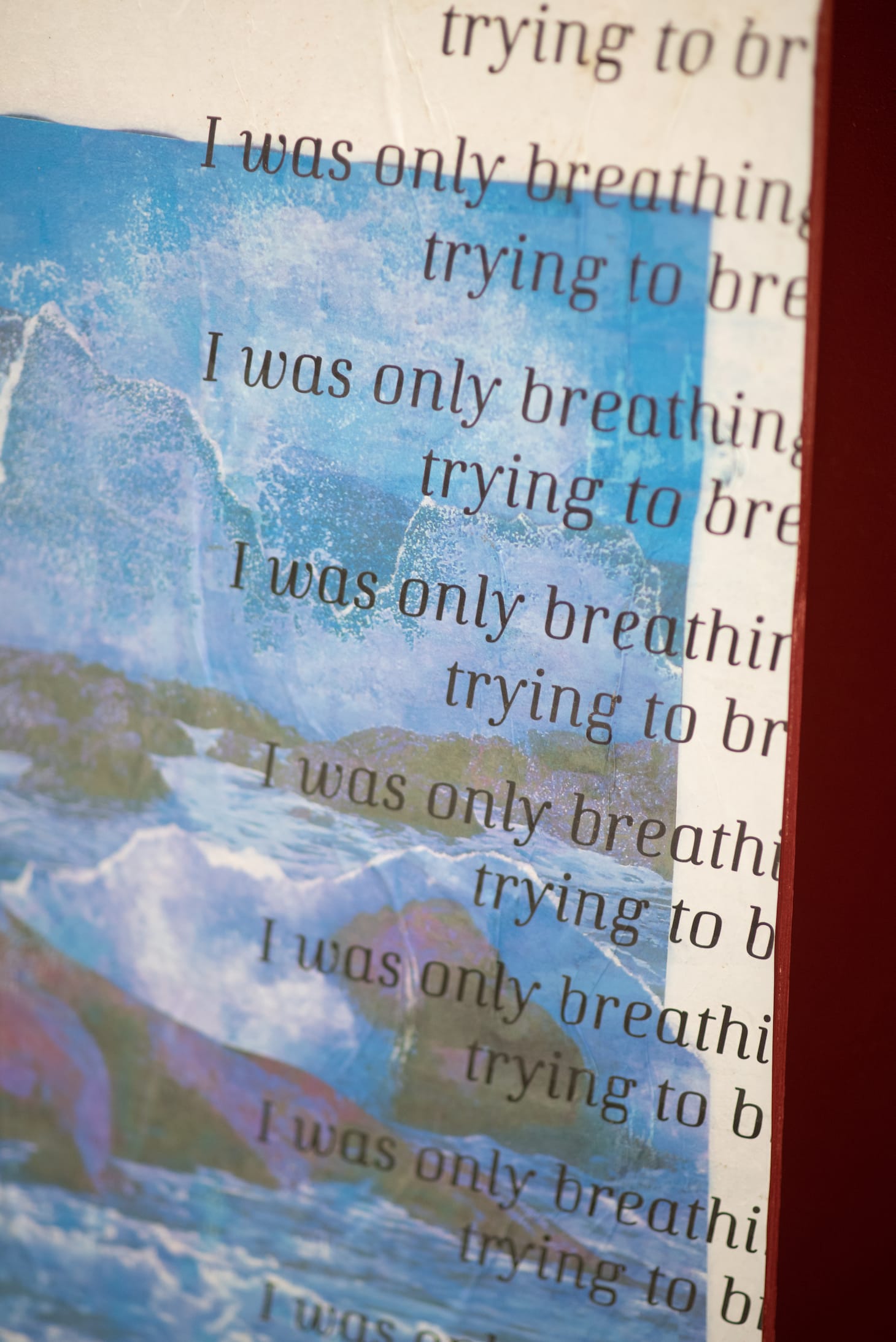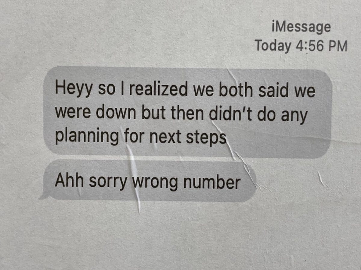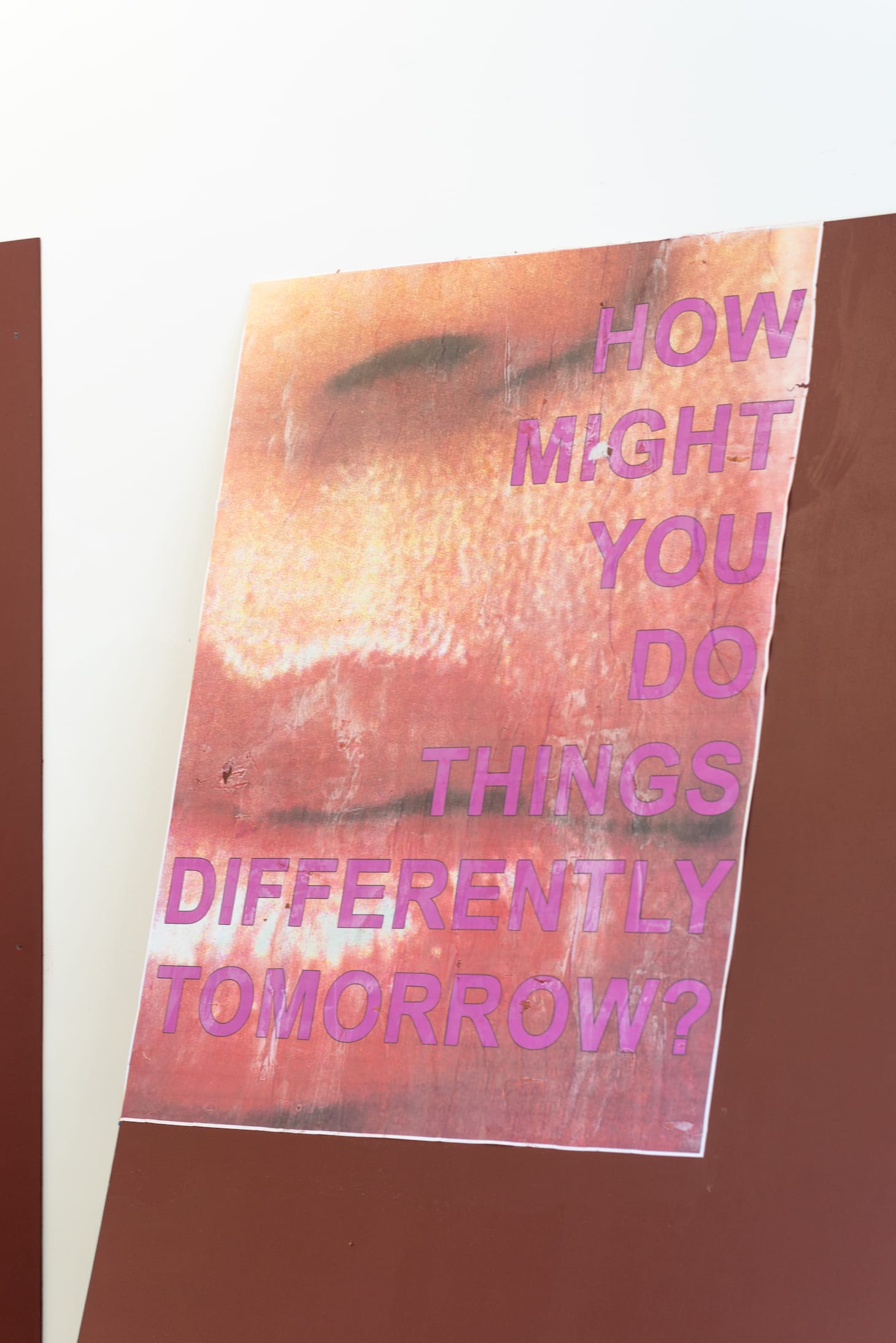 Materials that speak — directly, indirectly, and, in some cases, with delightful idiosyncrasy — to the interstices of artistic production and themes of romantic love and desire are submitted by each artist and rotate on a weekly basis. These range from videos and search engine results to iPhone snapshots and text messages. Each week of the exhibition, Reynolds intuitively arranges new material throughout the gallery, collaging and wheatpasting printed media onto visible surfaces, and draping pages sculpturally over speakers and on the ground. A tender iMessage exchange appears above footage of the Guyanese rainforest; a Google image search for “black leisure,” depicting a number of black futons and a dearth of human beings, is displayed across from a poster of a nose and glossy lips, with the text “HOW MIGHT YOU DO THINGS DIFFERENTLY TOMORROW?” printed in a boxy fuchsia font.