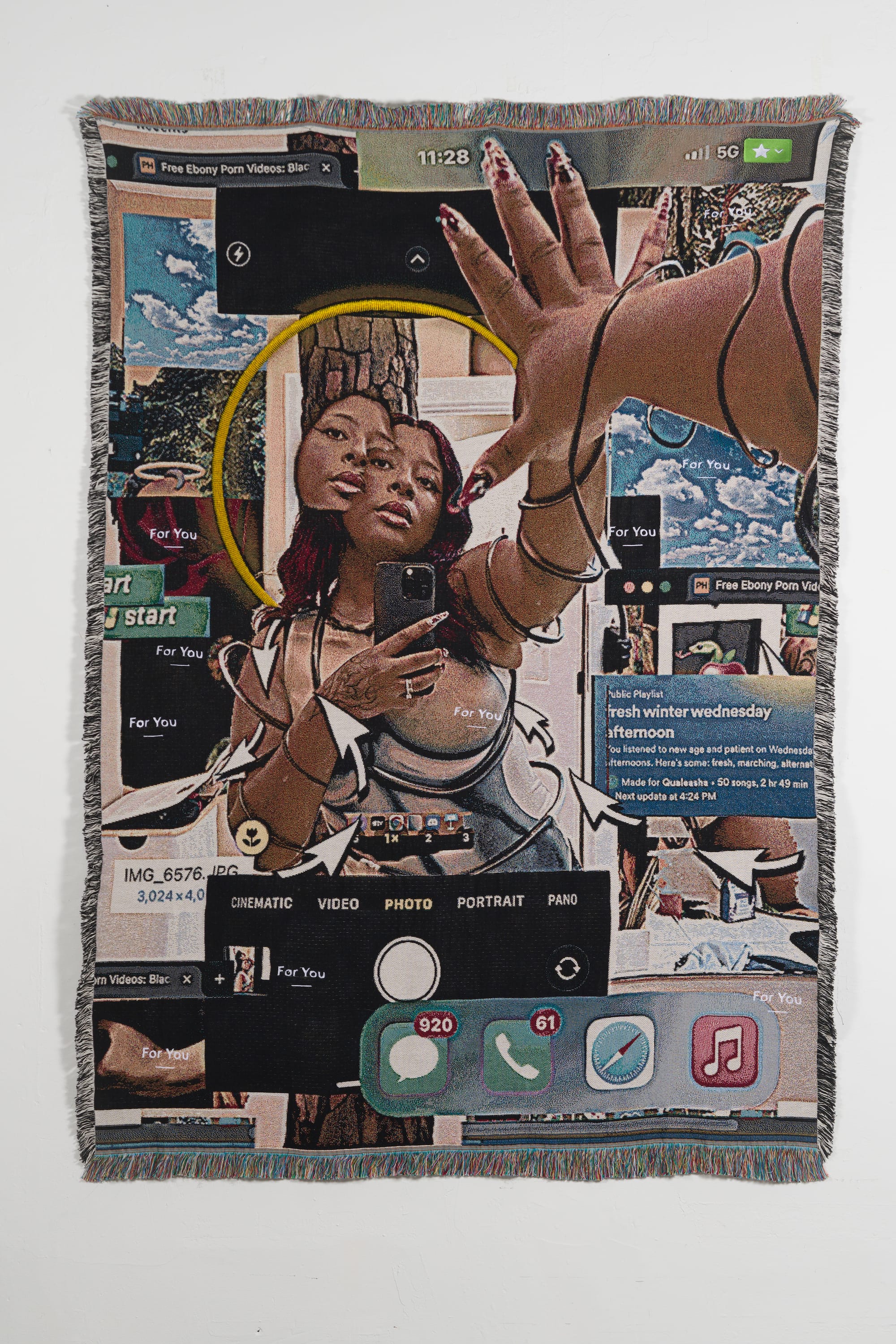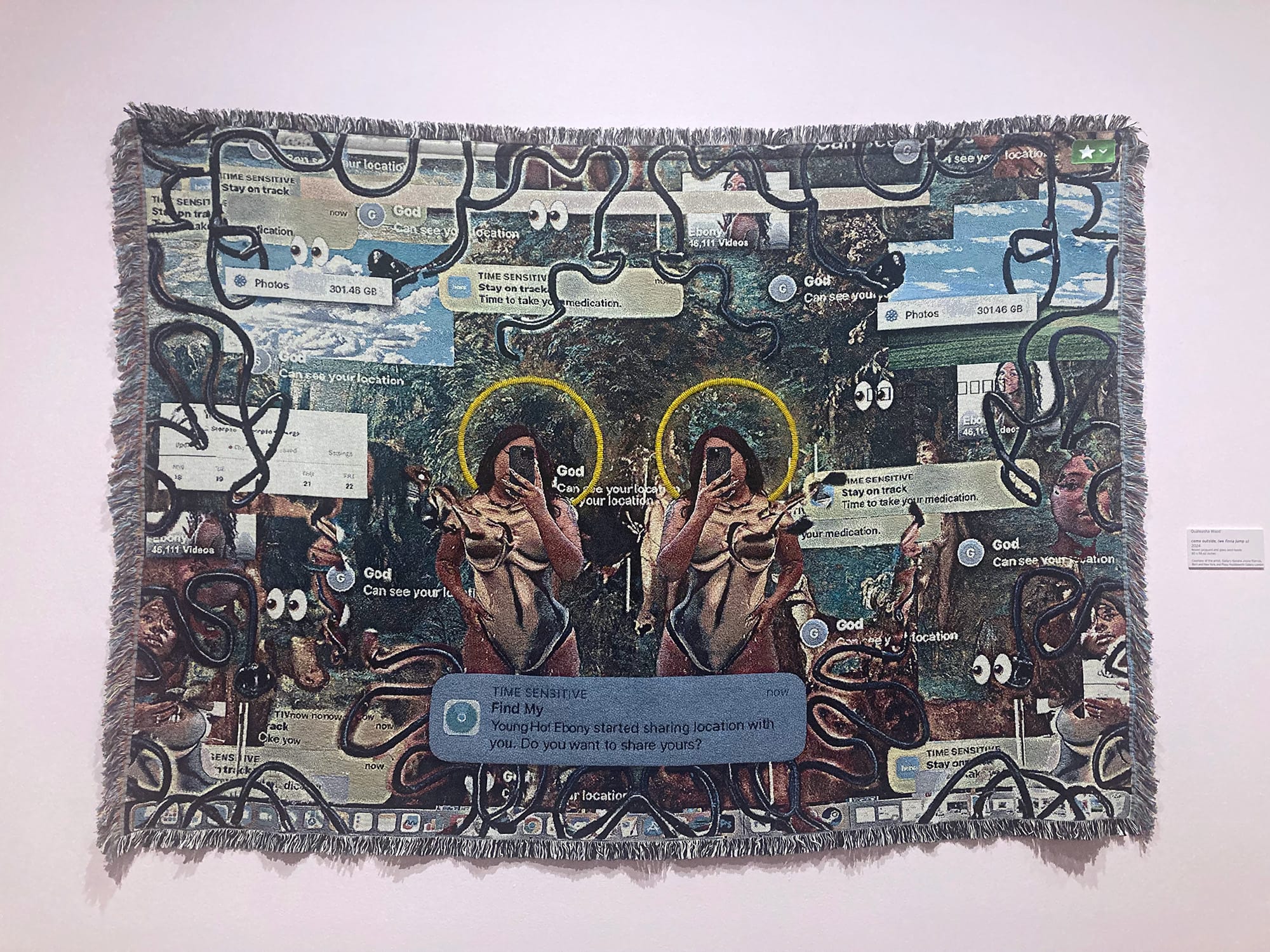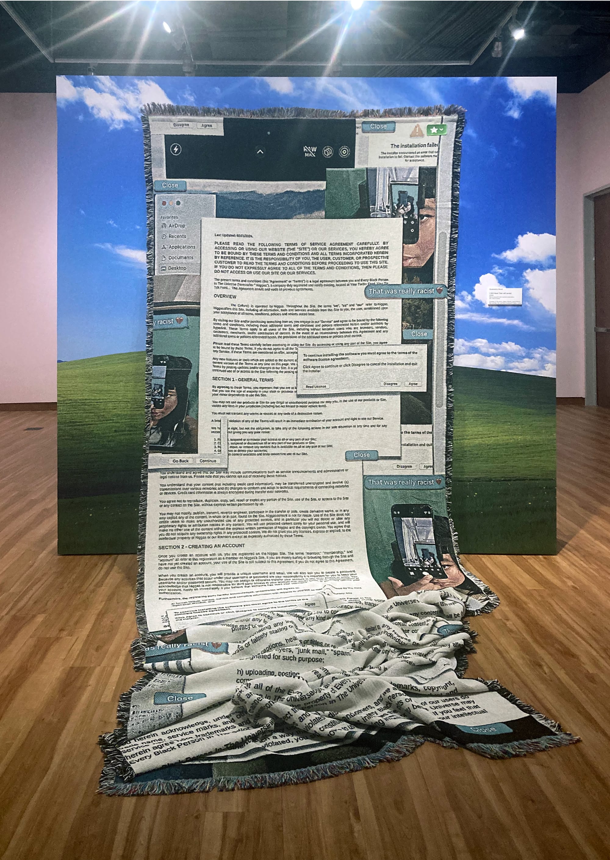 But the work is purposefully illegible — these T’s and C’s fold over themselves into a pile on the floor. Error messages and text bubbles make it impossible to accept or deny the terms, to bypass this bureaucratic block of text and reach the free Internet beyond. The work represents Black disenfranchisement within American culture, the seriousness of which Wood gently undercuts with humorous selfies and an ironic text bubble at the margin of the weaving that reads, “that was really racist 💔.”