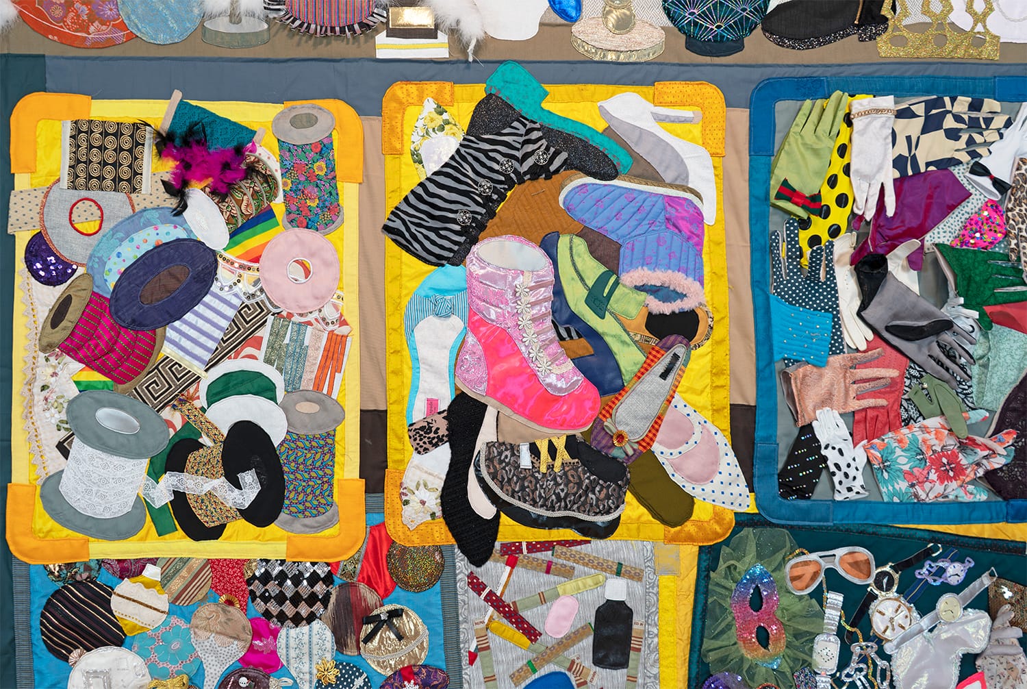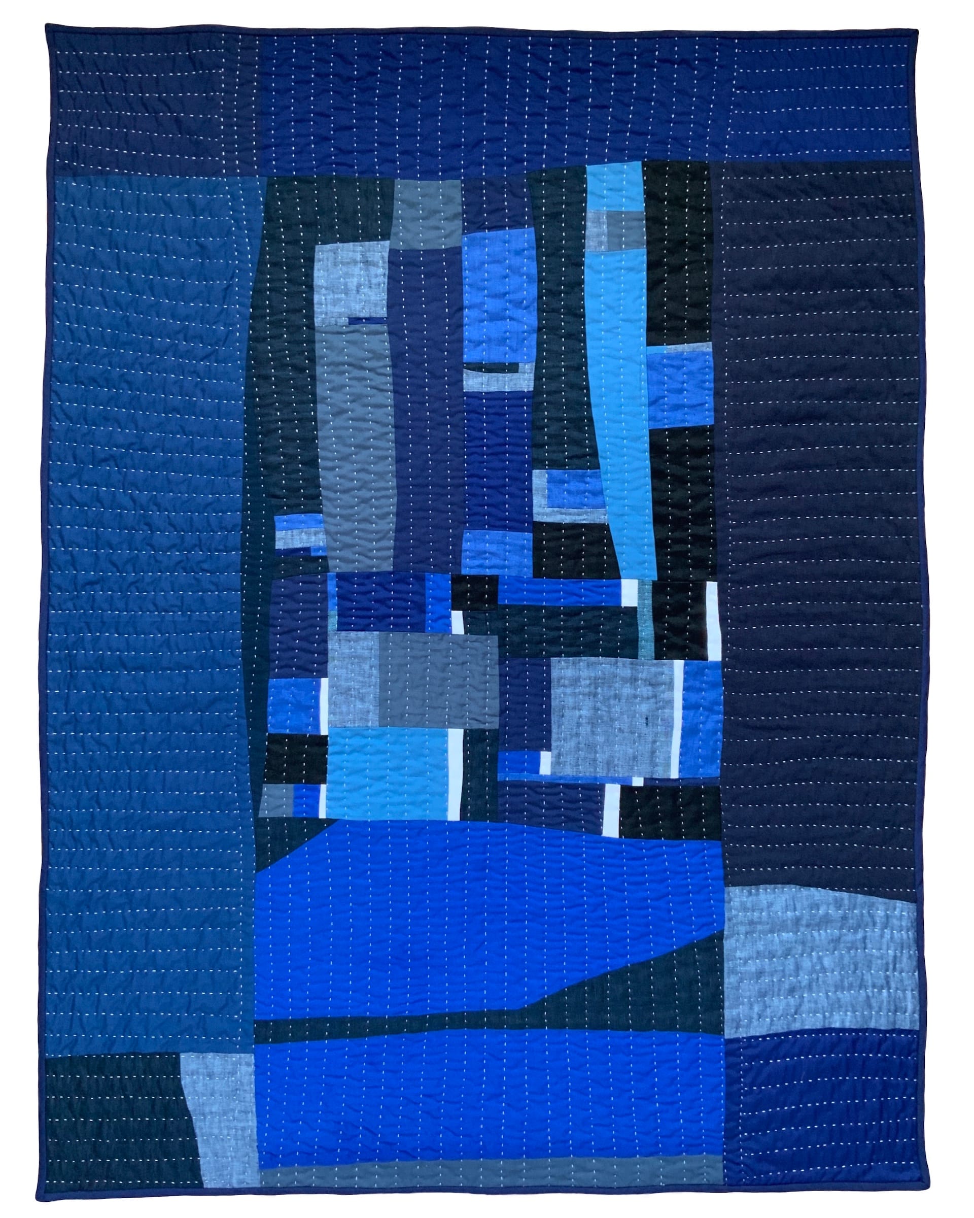Jackson Heights-based textile artist Lee Jensen received a New Work Grant for her exhibition Sewn Cities, Woven Worlds, which comprises a series of hand-sewn quilts constructed of reclaimed fabrics. Jensen spent the first half of her life in Copenhagen, Denmark, and the second half in NYC, and she described the work as “abstract textile portraits of my cities.”