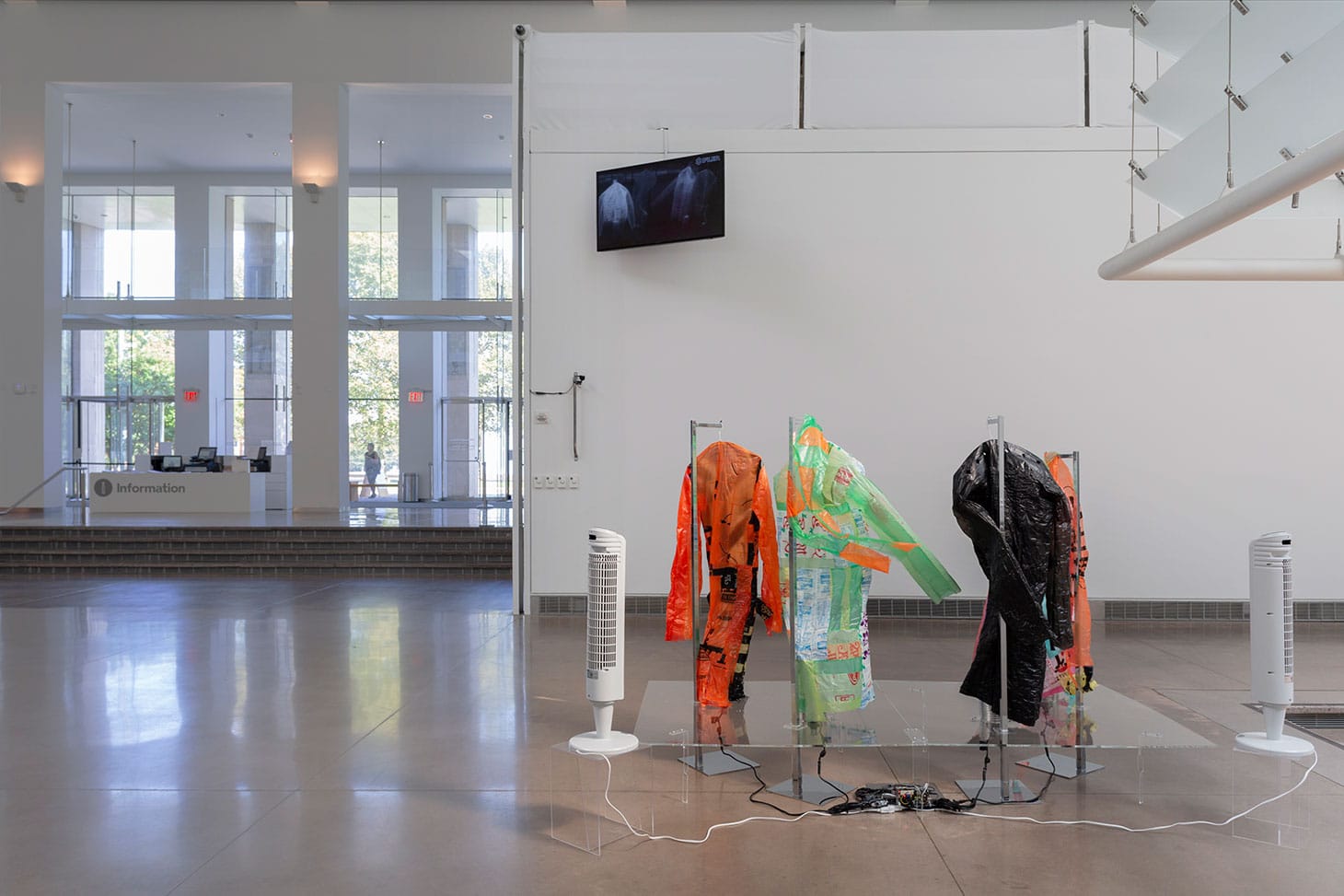 Evoking tools of non-diplomatic relations, Asif Mian’s installation, “Nothingness & Specter” investigates the technological limits of thermal infrared cameras used in drone targeting. Plastic bags from local Queens businesses are fused together to form multi-patterned polypropylene smocks, which hang on steel stands like wispy scarecrows. Nearby, oscillating fans circulate hot and cool air, as ghostly figures appear and disappear on a closed circuit monitor fed by a thermal camera. This use of cameras associated with drones reminds viewers of the United States’ forever wars abroad, opening a searing critique of the domestic surveillance of Queens’s diverse population, by staging this elaborate decoy diverting state violence.
