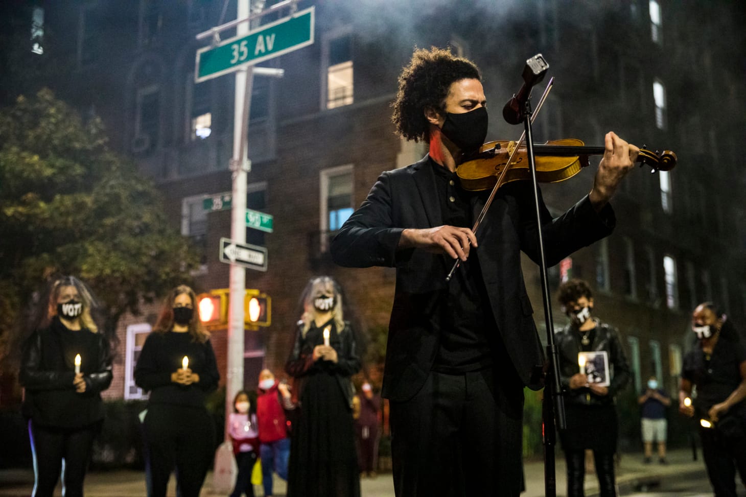 Mendoza, a filmmaker, author, and activist based in New York, organized the walk with the help of artists Sarah Sophie Flicker, Becky Morrison, Niama Sandy, and Tanya Selvaratnam. The evening began with a performance by violinist Kobi Malkin, who played Joseph Achron’s “Hebrew Melody” as mourners left white roses on the hospital steps.