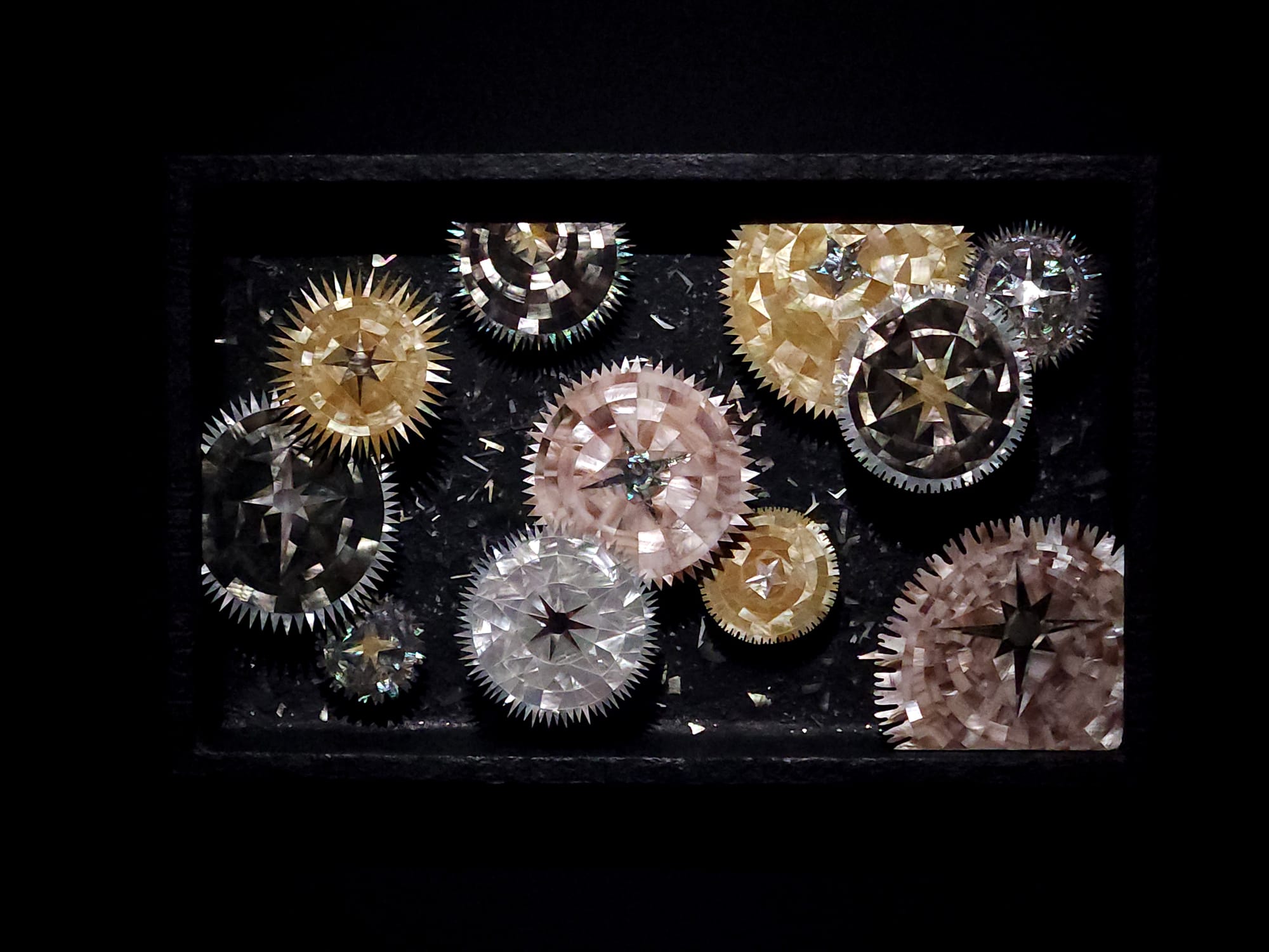 Similarly reaching into tradition and lineage, queer identical twins André and Evan Lenox-Samour work collaboratively and meticulously with mother of pearl — a reference to intricate family heirlooms that were safeguarded during the Nakba in Palestine. Their shimmering sculptures pay homage to these precious objects and to the storied mother-of-pearl artisans of the Hazboun family in Bethlehem through motifs like arrows and eight-pointed stars, evoking themes of direction, migration, and placelessness.