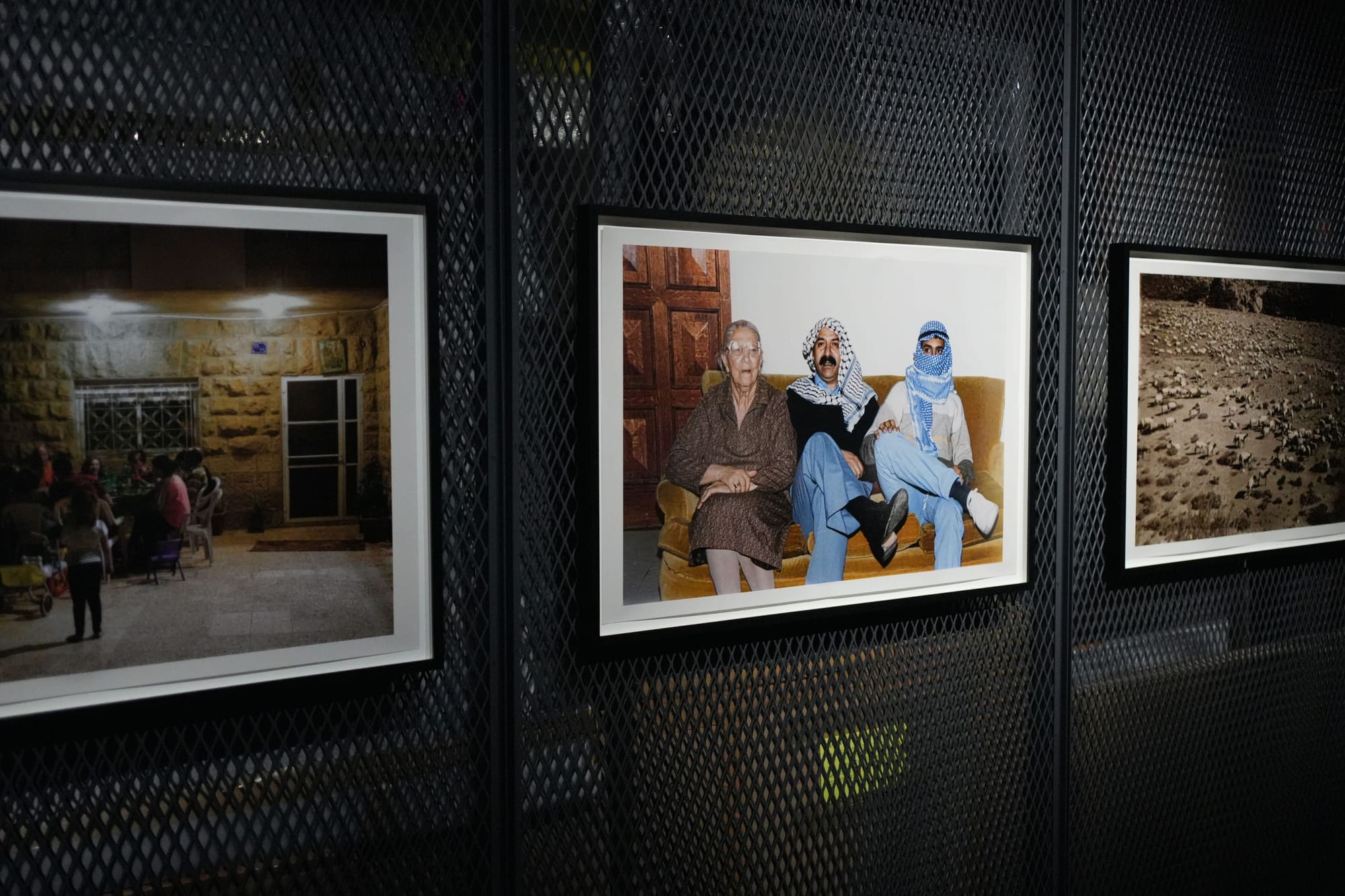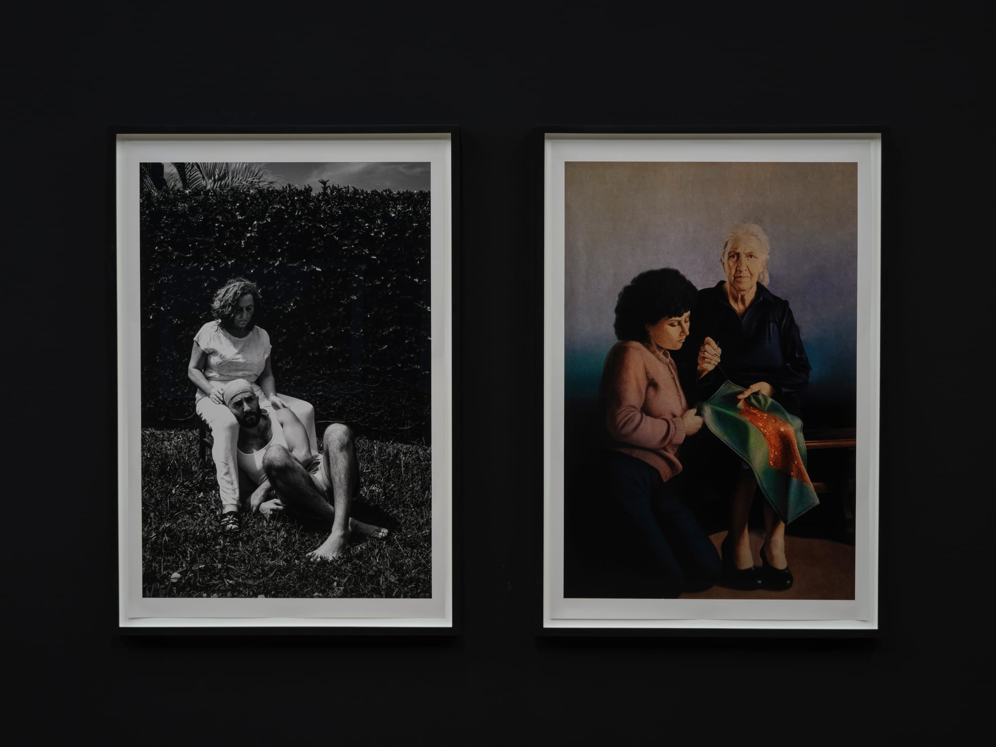 In the exhibition, Rischmawi presents five archival and contemporary photographs depicting family members in Florida, Beit Sahour in the Occupied West Bank, and San Fernando in Chile. In one diptych, a black-and-white photo shows Rischmawi laying their head on their mother's knee, mirroring the adjacent print of a now-lost painting of the artist's mother and great-grandmother in a similar pose.