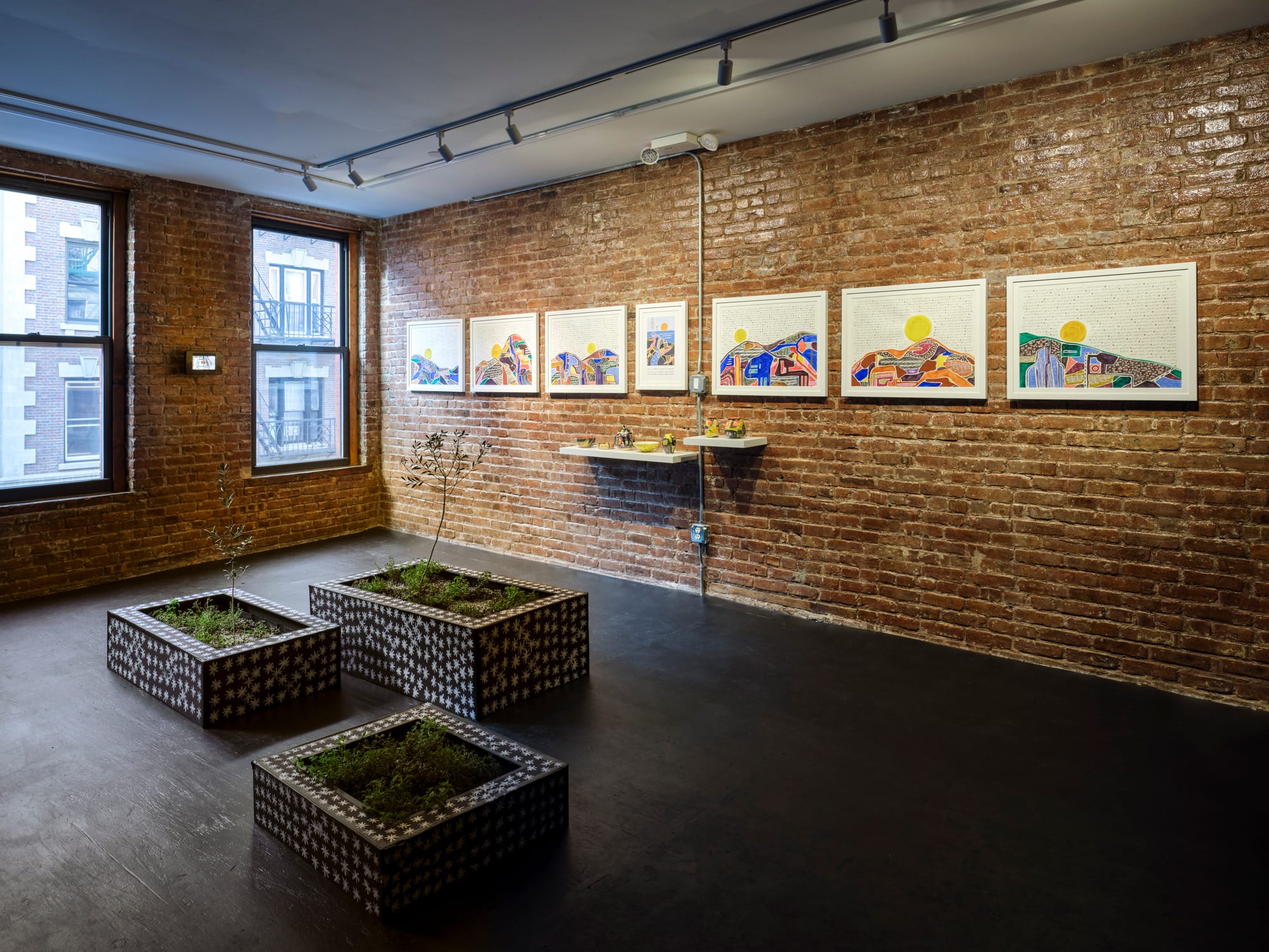 Upon entering Participant Inc. gallery in Manhattan's Chinatown, a pitch-black embrace invites us find one another in the dark. As our eyesight adjusts, a constellation of works illuminates [minna|منا]of us, a group exhibition open through March 15 featuring queer artists of the Palestinian, Jordanian, Lebanese, Syrian, and Egyptian diasporas. Wafts of burning incense mingle with the instrumentals of a commissioned sound mix by Palestinian musician Falyakon to direct visitors through the show, which Palestinian-Jordanian-Egyptian artist Ridikkuluz curated as a space for anti-colonial futurism across tradition and geography.