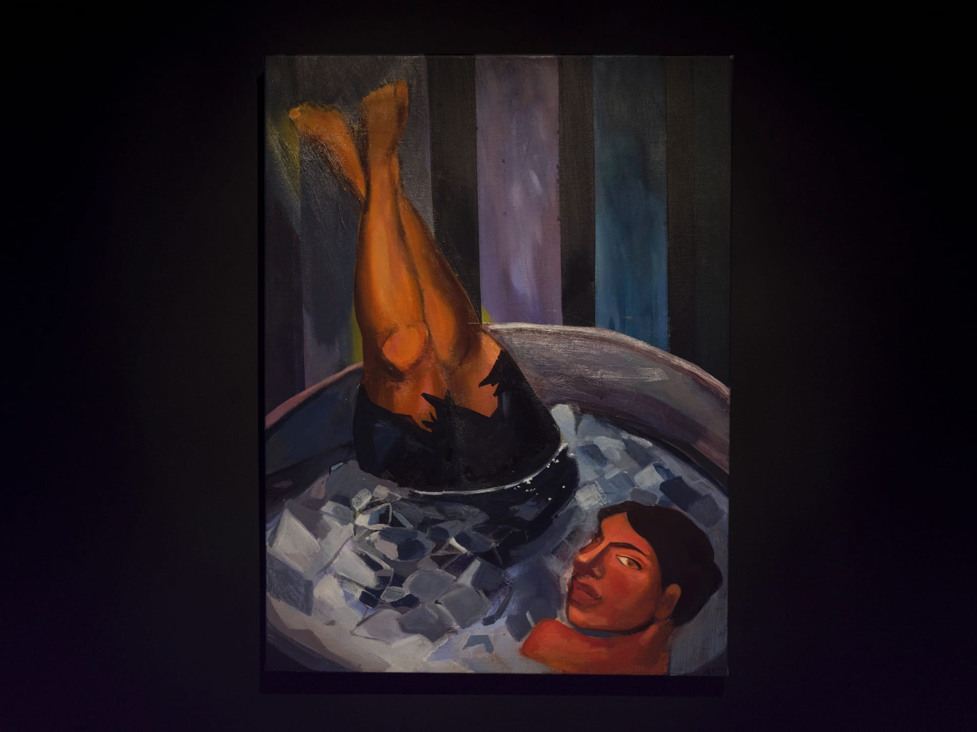 On the next floor, home to exhibition co-organizer SALMA gallery, hangs Syrian-Canadian artist Anka Kassabji's poised self-portrait. Relaxing in an icy bath, she gazes over her shoulder with authority while her legs, crossed at the ankle, jut out from the water — resembling the neck of a chilled champagne bottle.