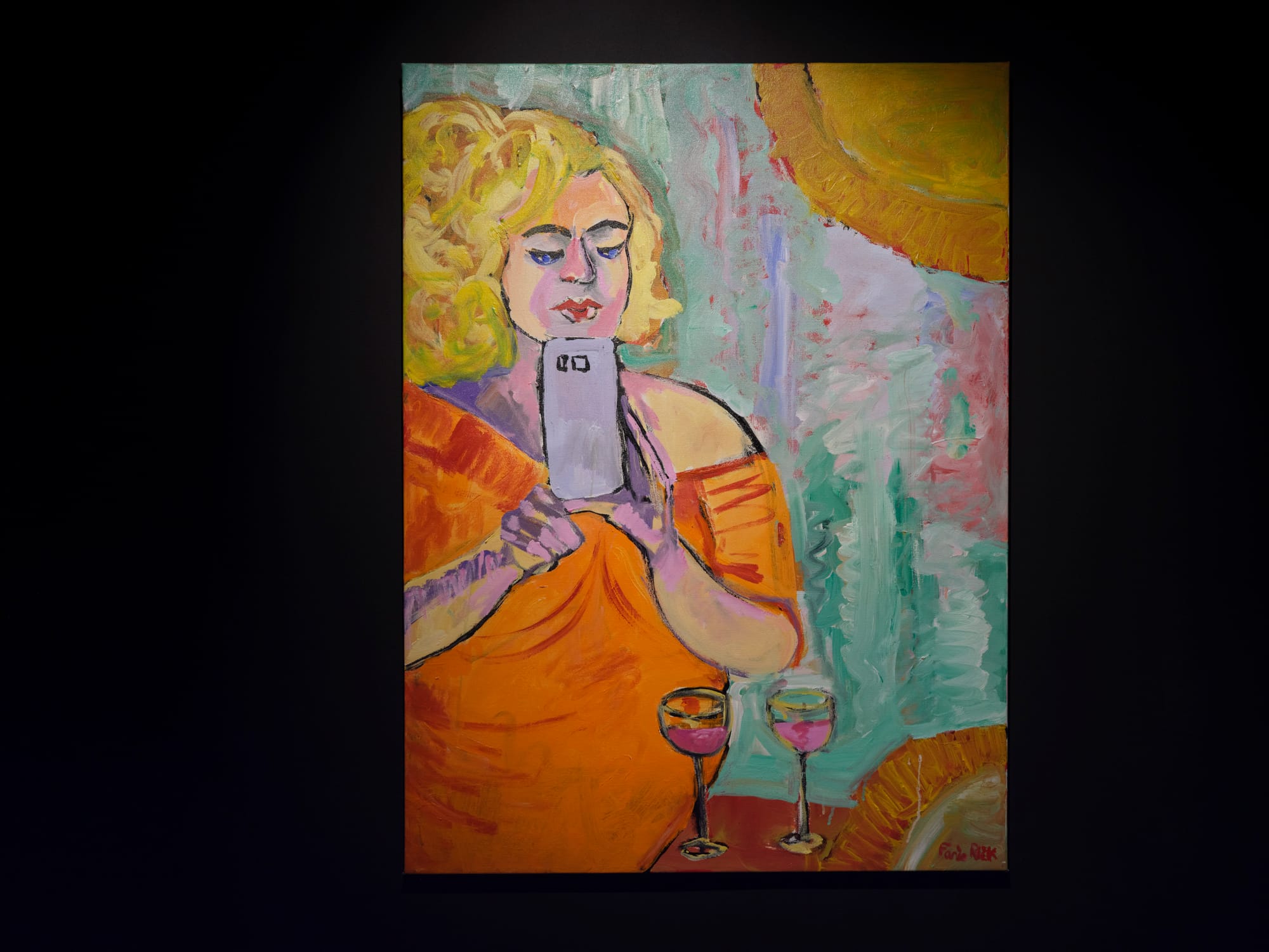 Across the gallery hang three vibrant paintings by Palestinian-Jordanian artist Fares Rizk that portray his better-known alter ego: Sultana, New York's first Palestinian drag queen. Blonde and buxom, Sultana day-dreams, eats knafeh, and snaps a selfie before date night with her devoted boyfriend — channeling her vivacity from the stage to the canvas.