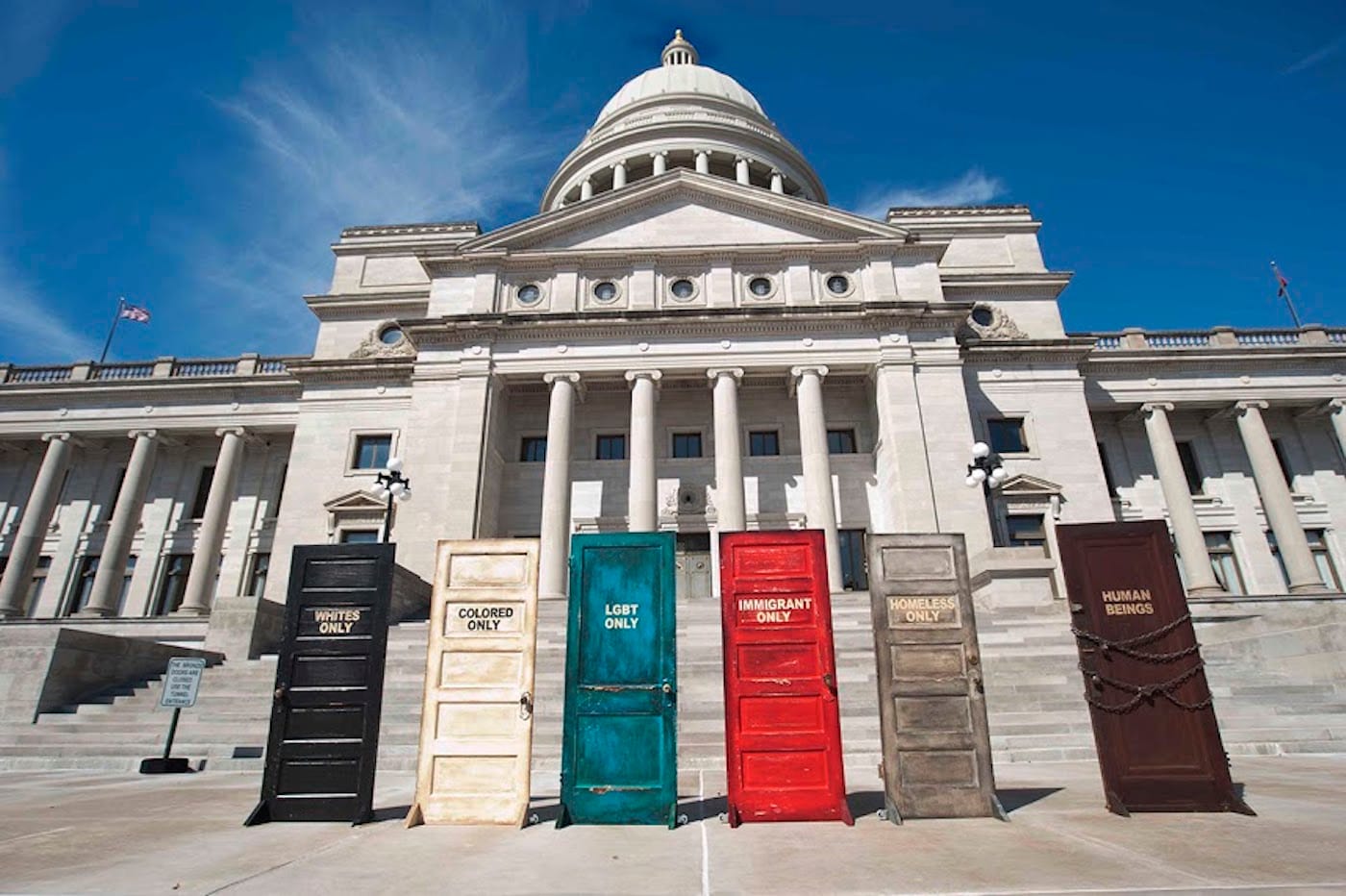 I am a queer artist in the Deep South whose recent work has been highly active in projects that involve human rights and equality. In 2015, while fighting Arkansas’s Religious Freedom Restoration Act (RFRA), I created and launched a national End Hate installation series. The RFRA bill had originated from then Indiana Governor Mike Pence and was quickly embraced by other states via the ‘ALEC Bill Mill’ to restrict gay marriage. However, the bill was so recklessly and dangerously written not only would have targeted the LGBTQ community but African American, Muslim and Jewish communities as well, reinstating cruel and deadly discriminatory Jim Crow laws overnight. HB1228, as it is also called, would have made it legal to deny life-saving medical care or even a sandwich in a restaurant to someone based on someone else’s “sincerely-held religious beliefs.” The anti-discrimination series was placed twice on the steps of the Arkansas State Capitol in protest, then twice at the National Mall at the base of the Lincoln Memorial in Washington, D.C. where it was viewed by over 250,000 people. The installation is currently on a nationwide tour as a 50+ piece collection.