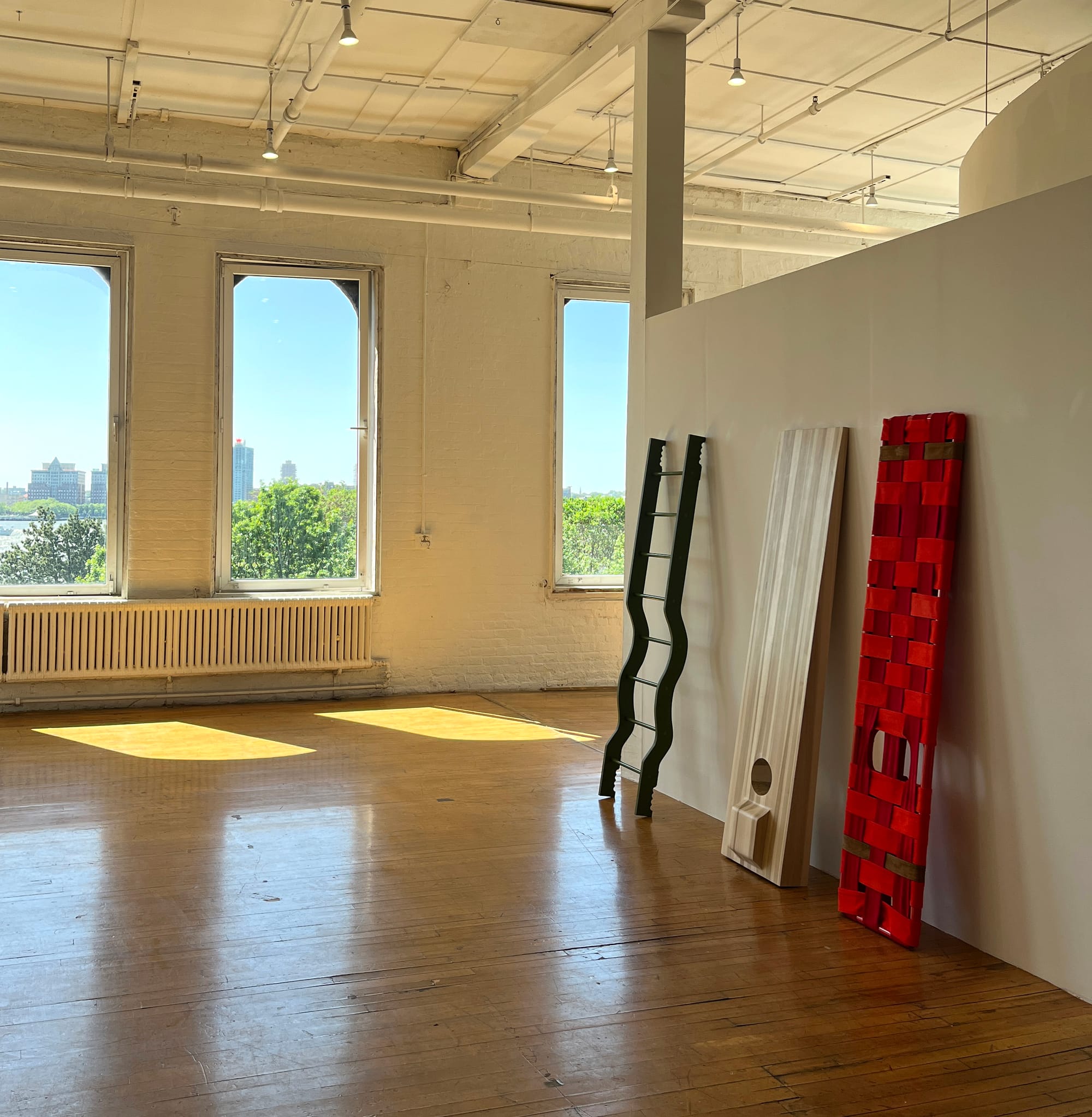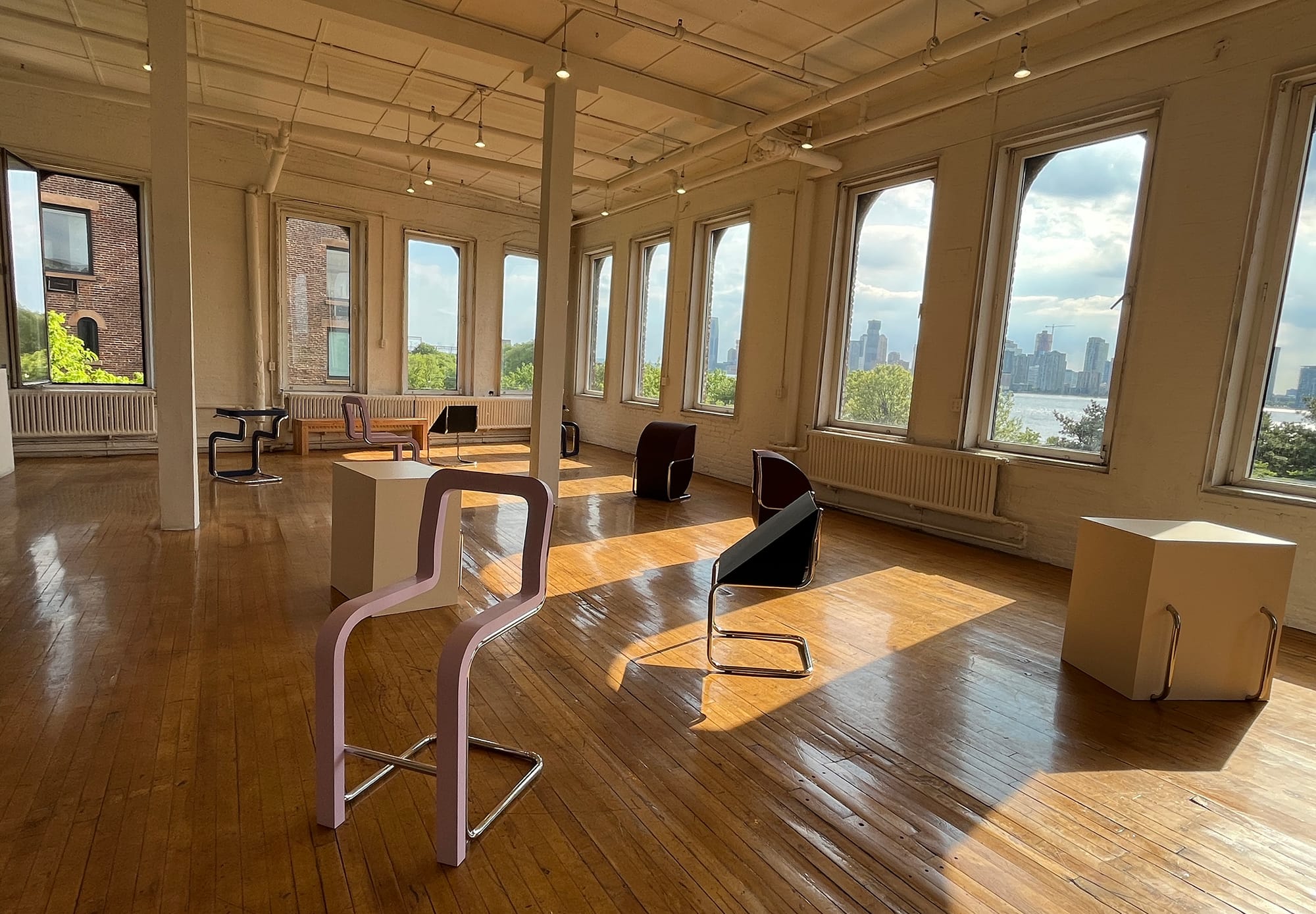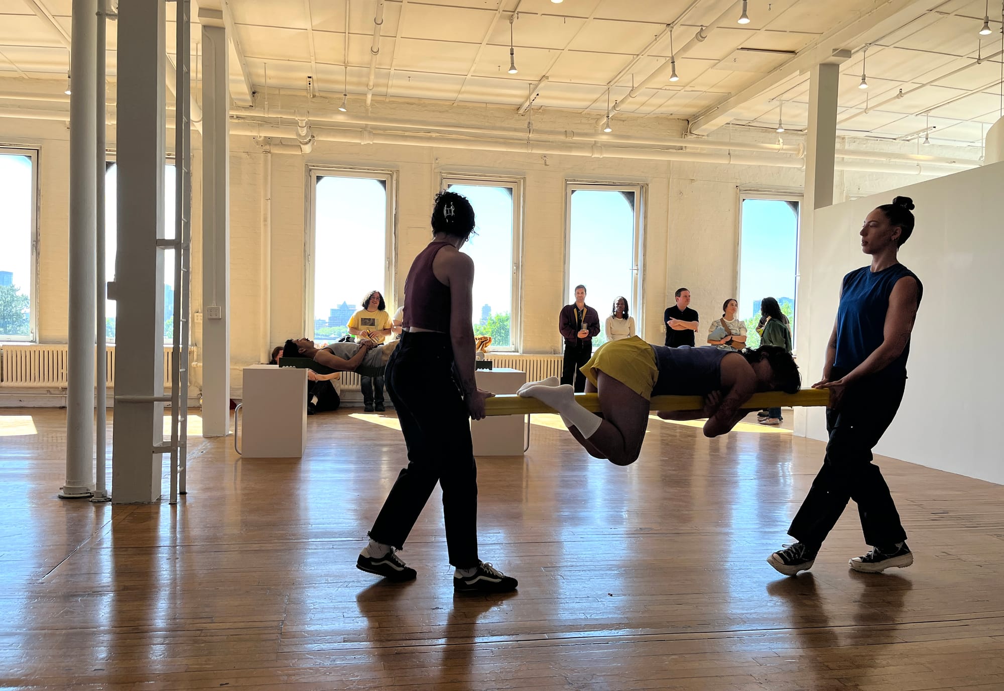 The same day I visited the Birkby exhibit, I saw Gordon Hall’s Hands and Knees at The Kitchen’s temporary home in the Westbeth Artists Housing complex, itself a kind of fantasy space, housing hundreds of artists, as well as a number of arts organizations. The exhibition and its accompanying performances, in which performers alternately carry each other through the space or rest on the sculptures, are rooted in an arrangement of abstract sculptures formed around recognizable curvilinear metal chair frames, as well as a set of support structures. When in use during the performances, they demonstrate an adaptive reuse of the chair-based works, in which bodies recline across the sculptures. While Hall’s stated intentions center on a “transgender politics that questions the norms that govern embodied life,” what felt top of mind seeing the work inside a gallery with views out to the park along the Hudson River, was creative adaptations of hostile architecture, not only by unhoused populations but also everyday users of spaces that always seem to be signaling limitations to how we should be using them, like benches intended to stop people from laying down, endless signs telling us what we’re not allowed to do, gates poised for closing, and police barricades stopping us from filling spaces entirely.