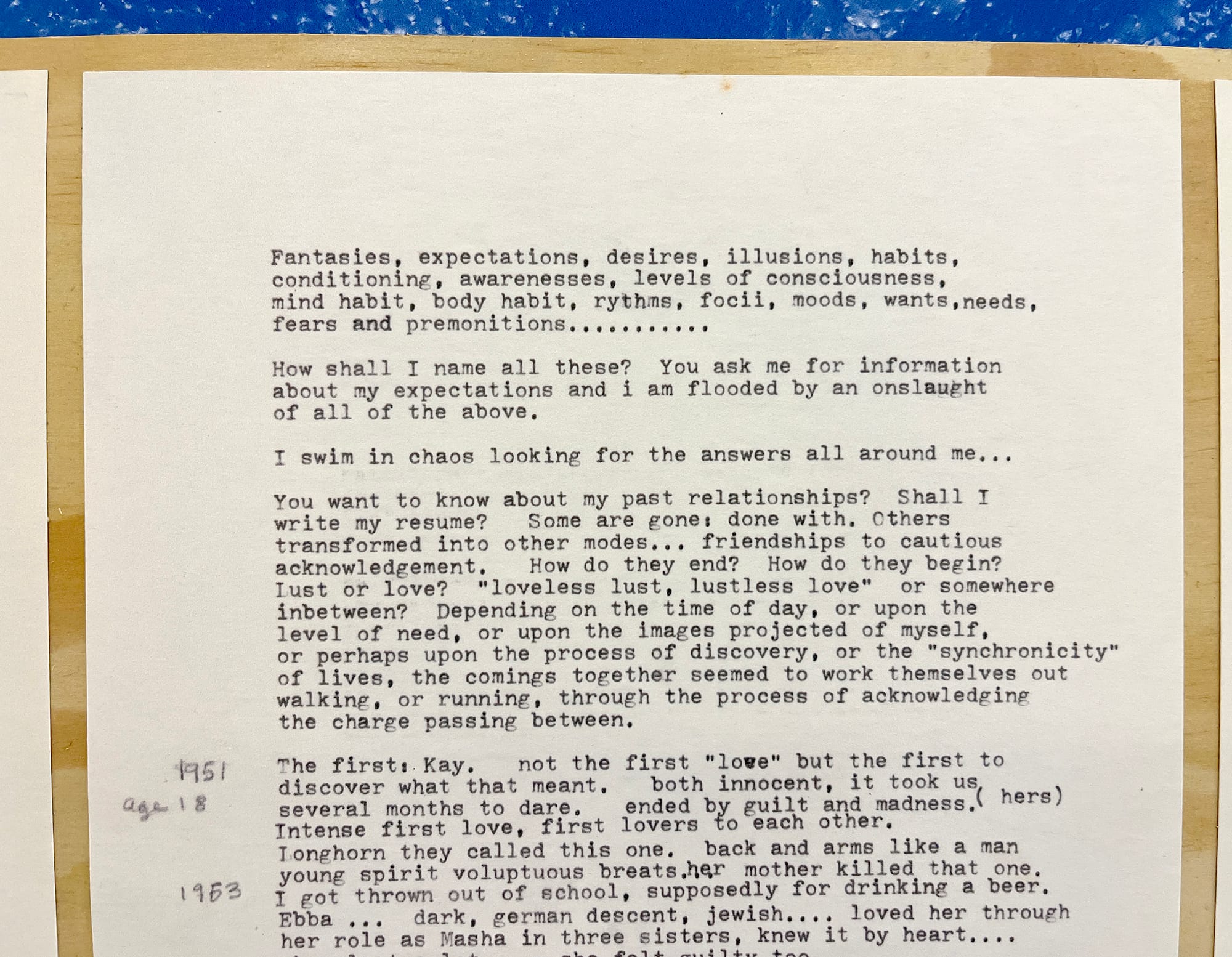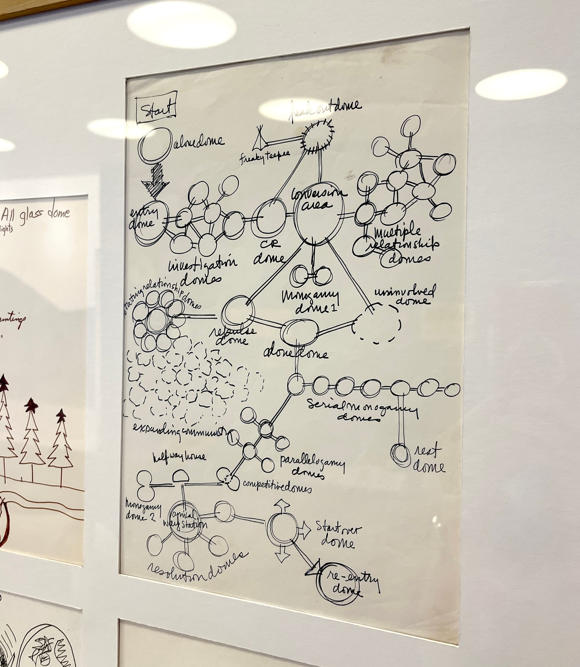 These workshops and the imaginings they produced undergird the exhibition, which features materials from Birkby’s life, and from the web of friends, lovers, and colleagues who participated in and shaped her physical and dreamt-of reality. Drawings from these fantasy workshops are some of the most compelling images on view. One by Birkby features a network of interlinked circular structures that invite would-be inhabitants to move through spaces and stages of coexistence, from “entry” and “investigation” domes to a “conversion area” and “multiple relationship” domes, allowing complex networks of interrelations to thrive and evolve. I couldn’t help but chuckle reading some of the final labels: “done dome” and “uninvolved dome.” Who hasn’t been there?