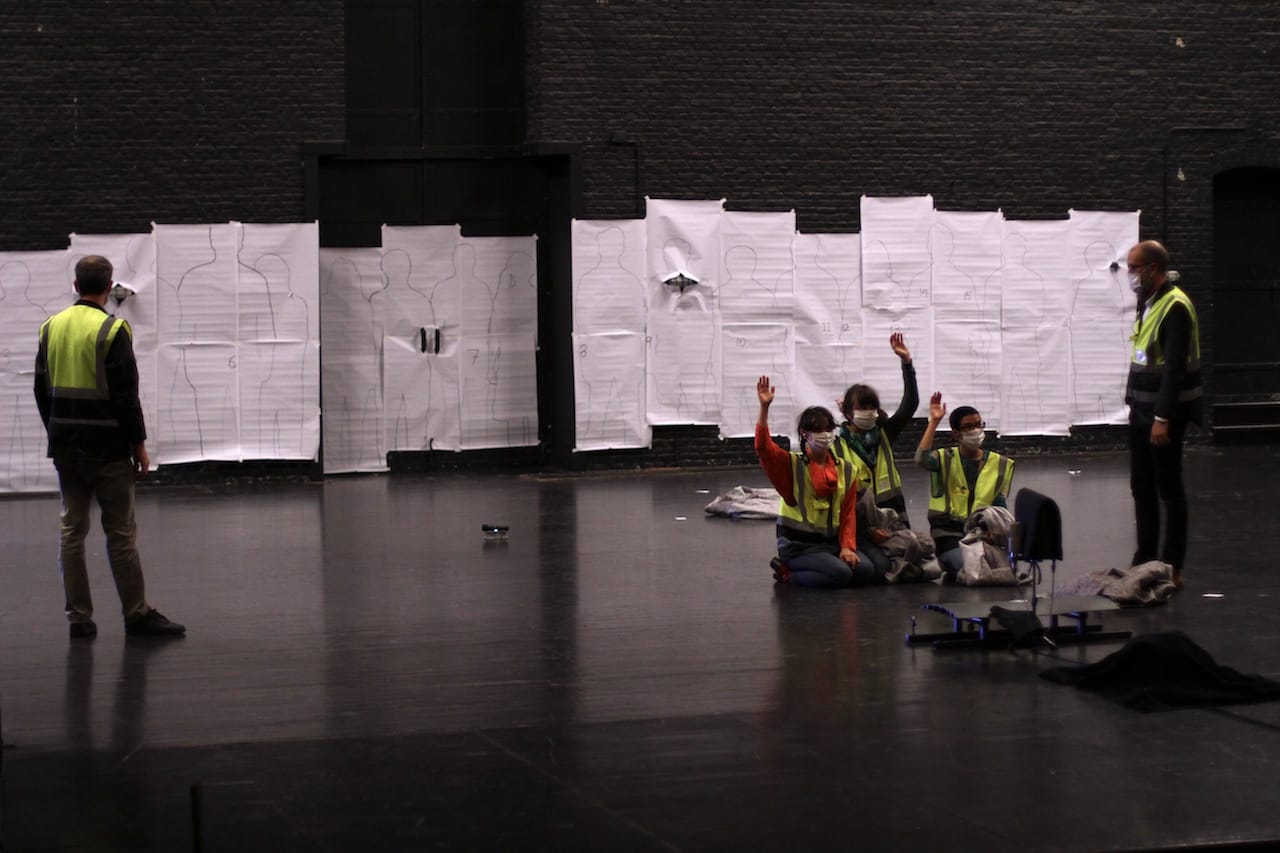 Ant Hampton’s The Extra People, also at Florence Gould Hall, was billed as an “immersive performance.” Translation: the spectators must wear headphones and obey the instructions of a mechanized child voice. After 15 minutes waiting outside the theater past the start time, the audience is ushered into a room where they spend the next ten minutes being outfitted with safety vests and the earphones. Another ten minutes or so are spent in a room being introduced to “the voice” and receiving an mp4 player. The next portion has the spectators sitting in the theater and occasionally being instructed to do basic movements: stand, sit, raise your arm. One person shines a flashlight around. Meanwhile, on stage, another group follows instructions to walk about and hide under some blankets. Later, the seated audience members will take their turn to follow the same instructions.