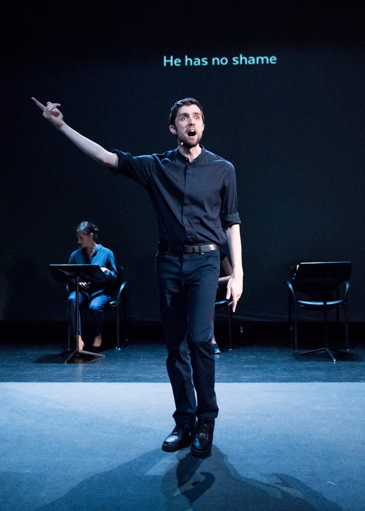 Gutierrez never lets his audience forget that he’s putting on a show. He uses direct address and often keeps the house lights up during the performance. The spectators sit on the stage, on three or all four sides of the dance floor, not in the raked house seats. He generally leaves the dancers onstage too, even when they are not performing. In one segment, he operates a sound system in plain view. We are all in the room together: no mysteries here. This self-consciousness is the focus of Part 2, which largely consists of a scripted dialogue, purportedly secretly recorded, between Gutierrez and his manager, Ben Pryor, with a stand-in performing Gutierrez’s role and Pryor playing himself.