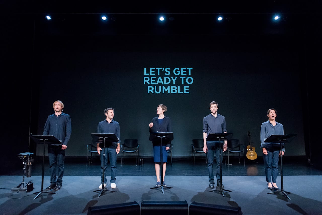 The current version benefits greatly from the very gifted performers: Vladmimir Kudryavtsev, Emmanuelle Lafon, Nuno Lucas, Barbara Matijevic, and Olivier Normand. They seem to be assisted by onstage electronic prompters, but their delivery is smooth and lyrical. In fact, they are essentially singing, and that’s where Lacoste’s piece lifts itself up into a higher realm. The language, or rather the languages, become streams of sound with pitch and rhythm. As the piece progressed, this conversion happened subtly and very pleasingly in my ear and mind.