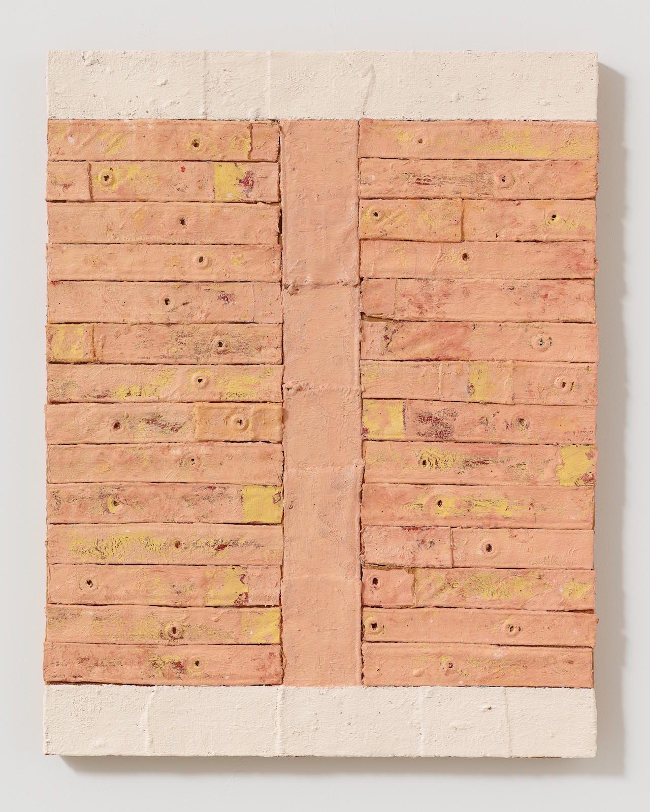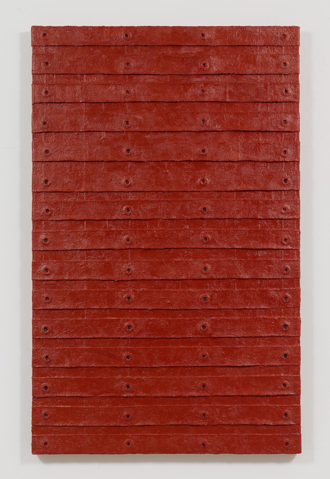 The only painting in the exhibition that slightly suggests the possibility of coming apart is “Bandaged Grid #1.” Its fraying strips of leftover canvas are applied like bandages to the grid of grommeted holes — suggesting bodily wounds, but also an interruption of the narrative of the grid in modernist painting, and therefore of utopian egalitarian order. A precarity. The strips and the paint functioning as poultice, also suggest possibilities of holding together, of healing.