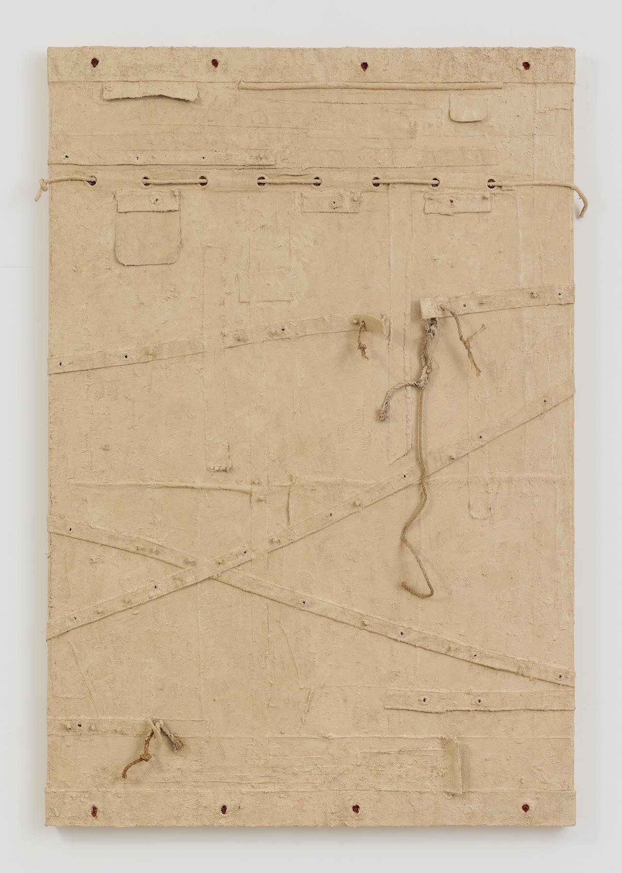It is true that there are fewer sculptural elements in many of the paintings in this exhibition than in my previous show. Or to put it another way, the sculptural elements changed as my conceptual interest shifted from the surface to the underside, the space not usually seen (unless it asserts itself or is exposed). Sculptural or relief elements such as straps, flaps, and pushpins that extend the painting surface out into the world are in conversation with the holes or orifices and the secret, buried, or muffled spaces below. In this way, the painting surface is physically and conceptually extended in both directions.