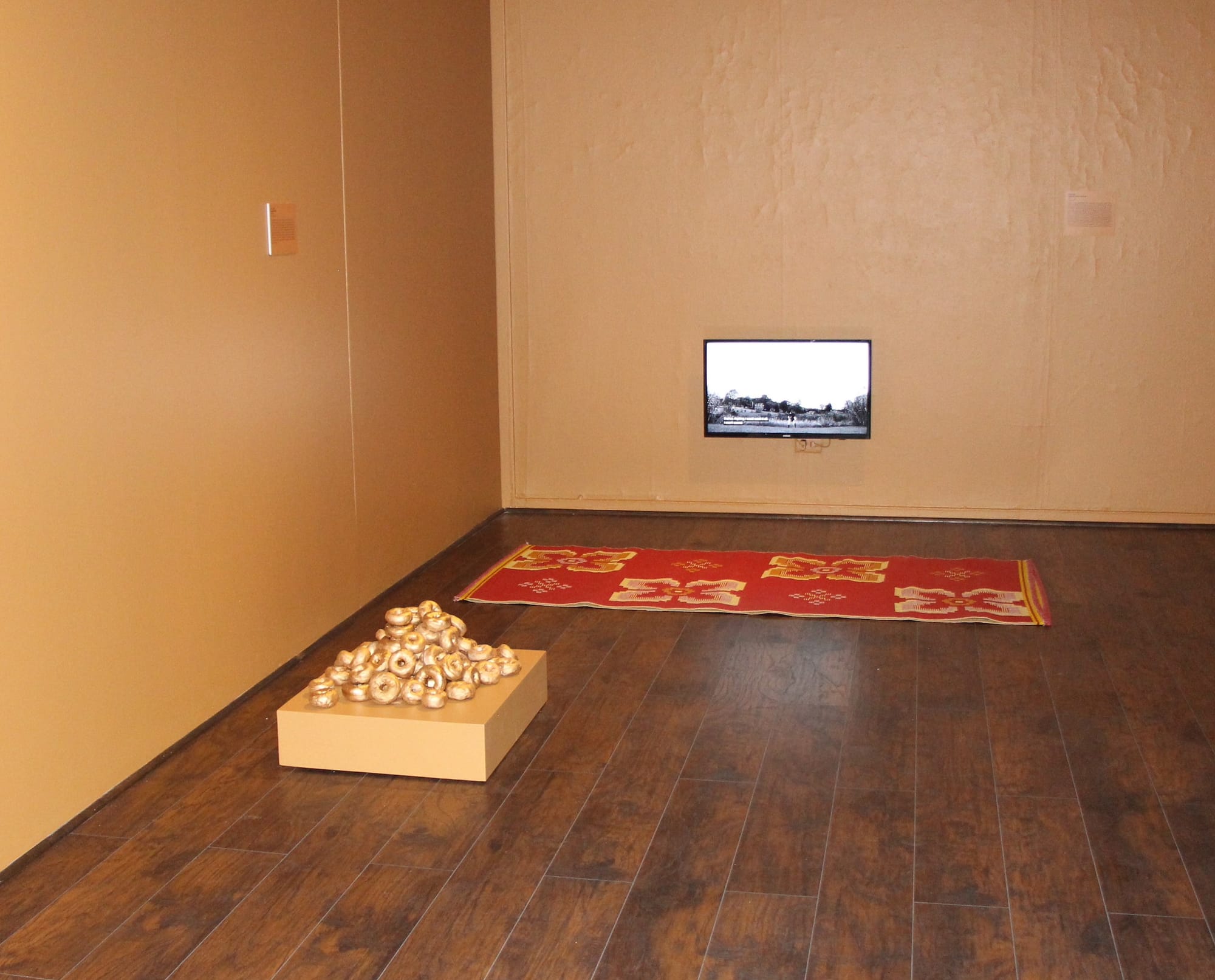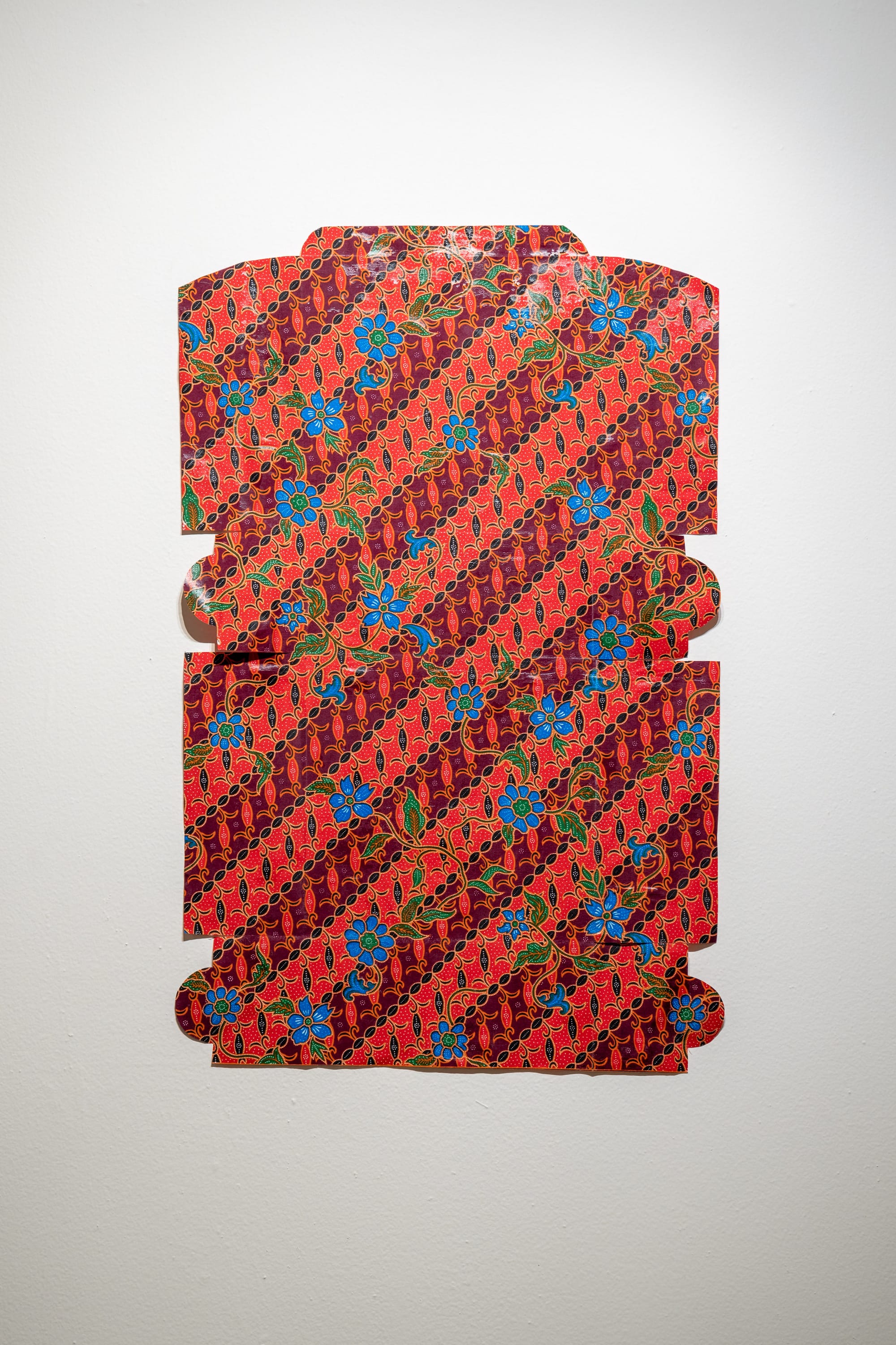For example, Vinhay Keo’s three embroidery works feature long, rectangular sampot fabric, a Cambodian garment and symbol of Khmer identity. The artist’s inclusion of the diverse materials of the sampot, ranging from silk to cotton to cork, traces its material and colonial history as a once unisex garment that became feminized under French colonial rule. “9” x 9” x 4”” (2021) is a cotton sampot in the form of a donut box, a replica of and reference to the pink donut boxes of Southern California, whose donut retail industry is largely dominated by members of the Cambodian diaspora — many of whom arrived here in the ‘70s to escape the Cambodian genocide under the Khmer Rouge regime. As Keo shared with me in an email exchange, “the donut industry became a model for economic upward mobility for Cambodian refugees and the latter generations. It’s also fraught with the fallacy of the American Dream narrative, the immigrant narrative of rags-to-riches.”