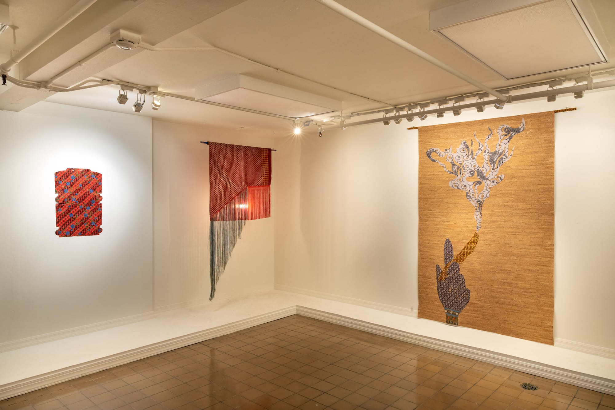 Stranger Intimacy II focuses on a series of wall and hanging works by Vinhay Keo, as well as a video installation by Prima Jalichandra-Sakuntabhai. Both artists are themselves members of the queer Southeast Asian diaspora, and their work investigates the residue of their families’ fraught history of immigration from Cambodia and Thailand, respectively: Keo’s family hails from Cambodia, emigrating to the United States as a result of the Khmer Rouge genocide in the 1970s, and Jalichandra-Sakuntabhai’s great-granduncle fled Thailand in 1949, forced into exile, first in China, then France, after attempts at forming a democracy in monarchic Thailand.