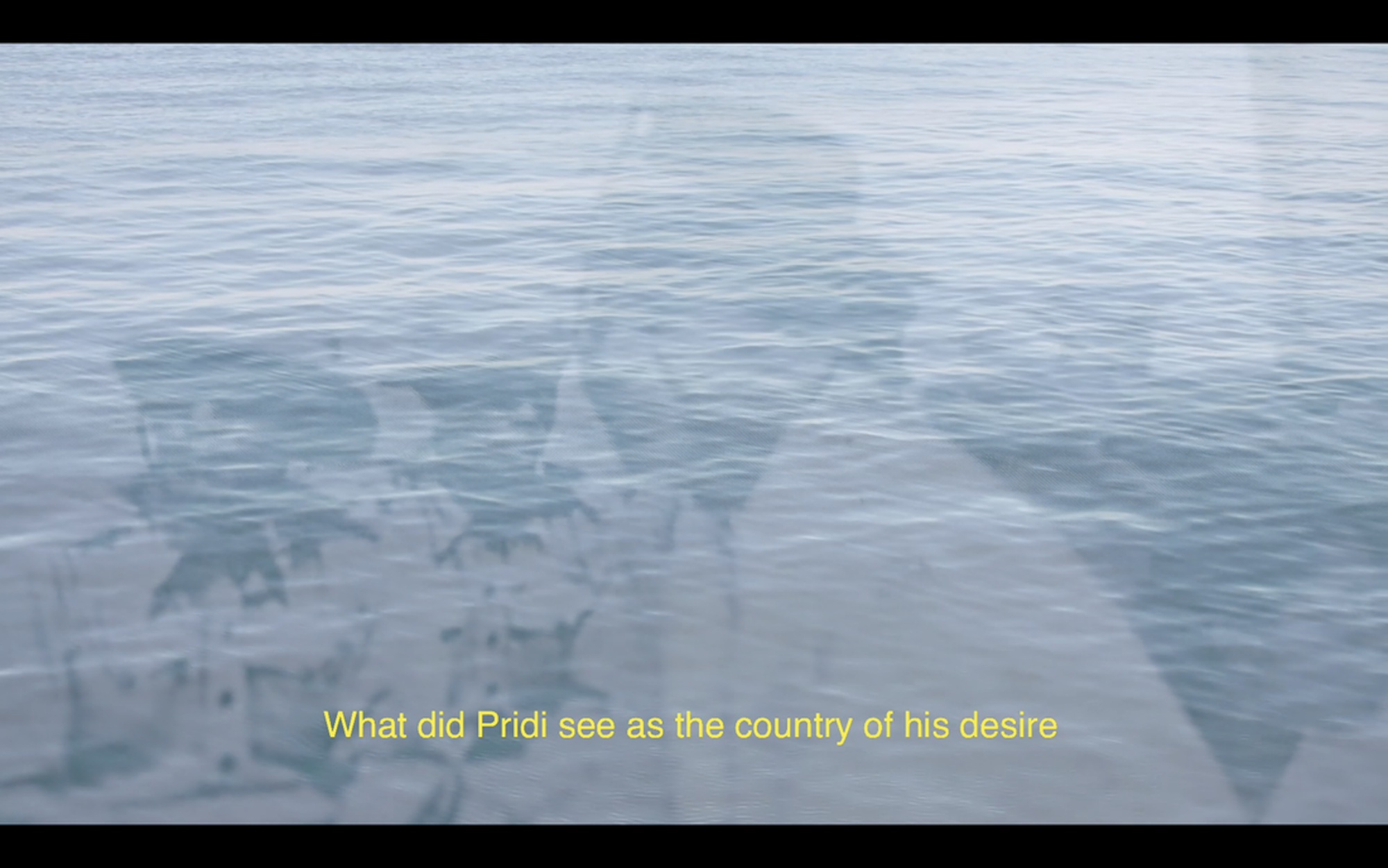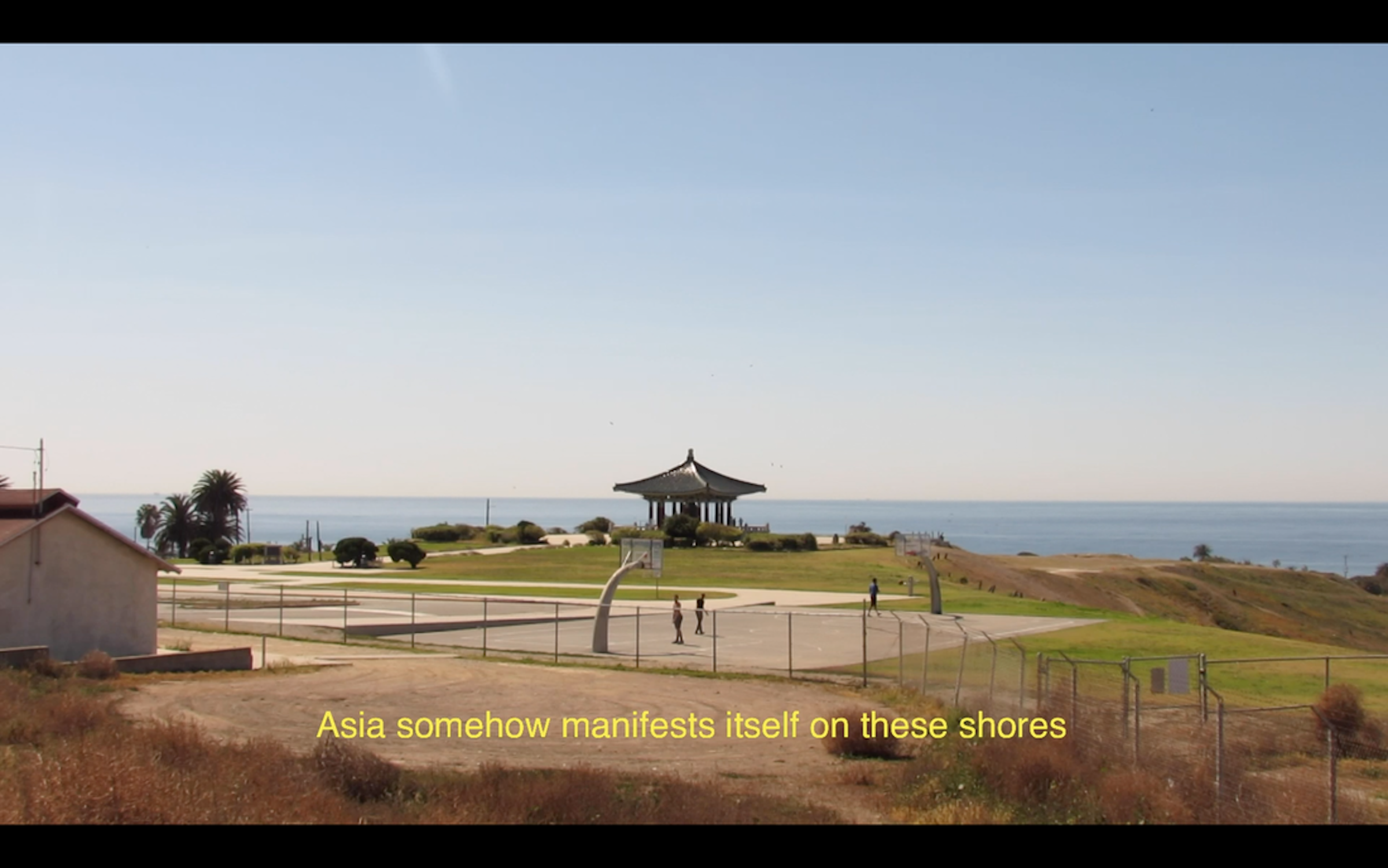 Similarly unraveling a string of references is Prima Jalichandra-Sakuntabhai’s poetic cartography of their great-grand uncle’s multiple exiles from his home country of Thailand. Jalichandra-Sakuntabhai’s video installation, “Ocean Network Express”(2021), centers on the video “Appendix A: Ocean Gazing” (2021), which narrates their great-granduncle’s migratory patterns by boat while in exile. These movements are placed in dialogue with the Southern California littoral, particularly the San Pedro Harbor, with its cargo ships sailing in and out — the remnants of military paraphernalia of World War II, the Korean War, and the Vietnam War littering the coastline, imposing defunct canons and concrete structures that a voiceover reminds us were designed to be a barrage contre le Pacifique, in reference to the Marguerite Duras novel of the same name. The stoic voice, the artist’s own, continues in a matter-of-fact monotone: “the Pacific Ocean is the ultimate barrier between the East and the West. These defenses are no longer needed: the enemy has been defeated. The Yellow Peril has been neutralized. We are safe now.”