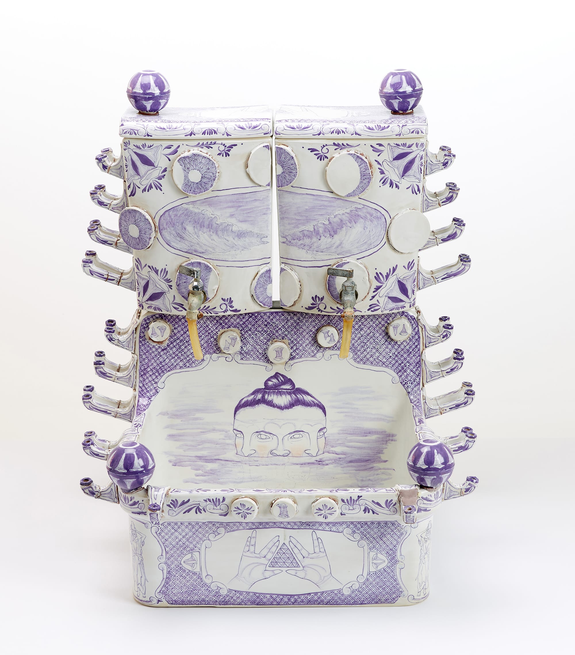 Green’s clay sculptures do not themselves function as ritual objects. Rather, they embody another key aspect of Jewish practice: they are commentary. They provoke us to think about the limits and potentials for the objects we use in religious and spiritual practice. Green’s sculpture “The Porous Sea” (Tub) (2019) is a basin too small for most people to submerge themselves in, but it still holds a complex and powerful spirituality. The beauty of transition is clear: only when we crane our necks to peer over the unfinished, rough outside can we see the intricately decorated, gleaming inside. A rippling surface suggests water, causing the paintings of hands, heads, and other ornamental patterns to crease, ripple, morph, and undulate.