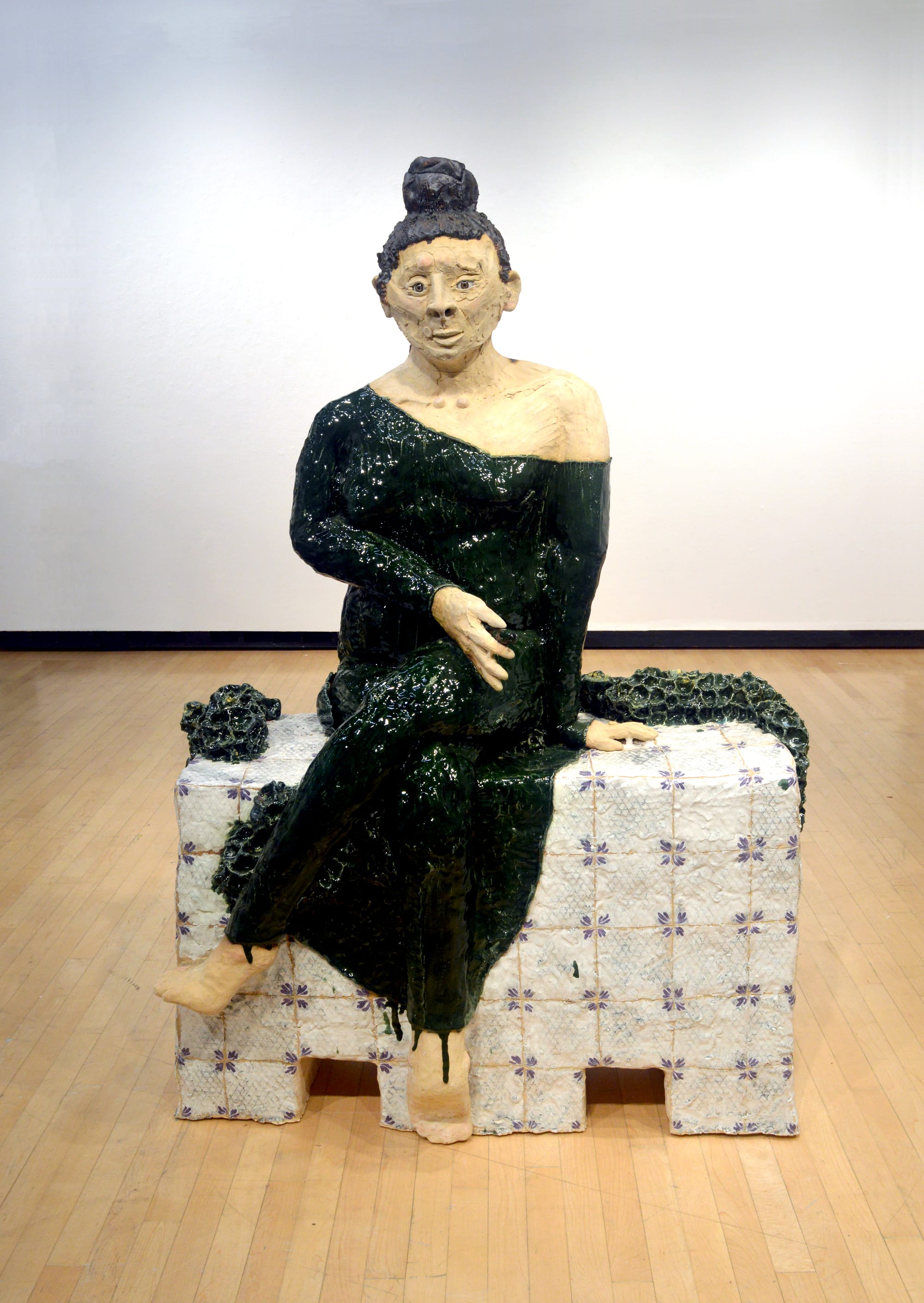 Clay’s malleability makes it a perfect material to investigate bodies in states of change. It’s only since last year that Green has delved into creating human forms, marking a transition for the artist herself. In Eye of the Fountain, Knot Thick and Fruitful Vine (2022), she presents three figures participating in the mikveh ritual, their rough skin and unrefined edges offering a contrast to the tight precision of the mikveh’s tiles. These participants are shown in multiple stages of transition, including one sprouting from a mound of mushrooms.