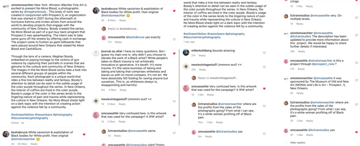 In anticipation of the digital exhibition's opening, Winston Wächter Fine Art shared an Instagram post announcing the body of work. After critical comments surfaced, the gallery added more information to the caption to further explain the photographs and eventually took down the post altogether. Screenshots of the since-deleted post show the statement added by the gallery: "Through the lens of a camera, Meghan Boody embarked on paying homage to victims of gun violence by capturing their portraits in scenes that are genuine to the culture and community of New Orleans. Boody is from Manhattan's Upper East Side.