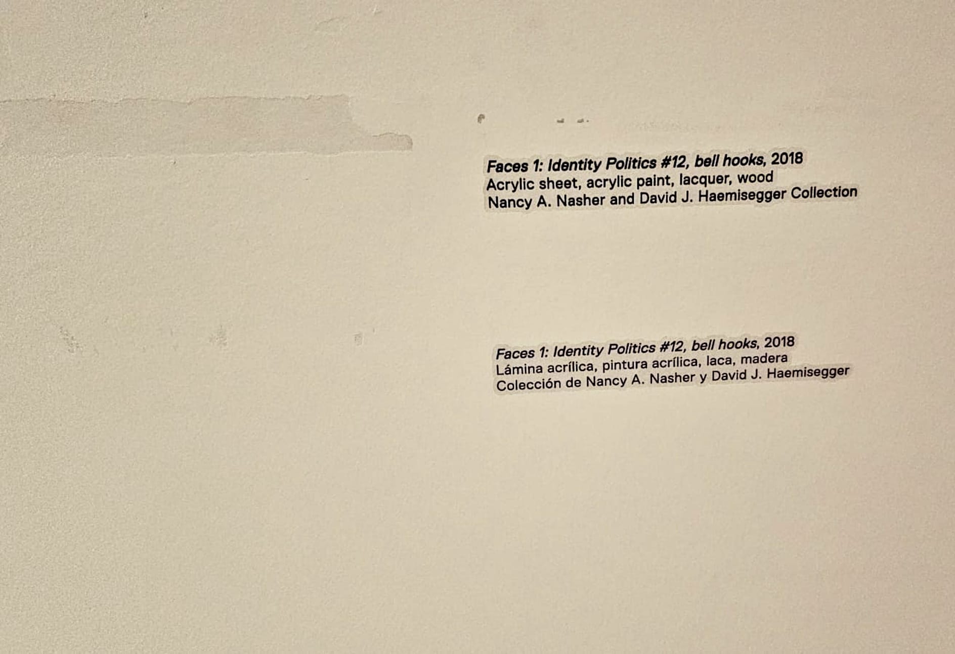 A photograph taken on Wednesday, March 6 shows a small area of peeling paint on the wall where a label appears to have been affixed and then removed — potentially for an artwork installed in place of Gaines's during the event. The label for another work in the series, depicting bell hooks, remained in place.