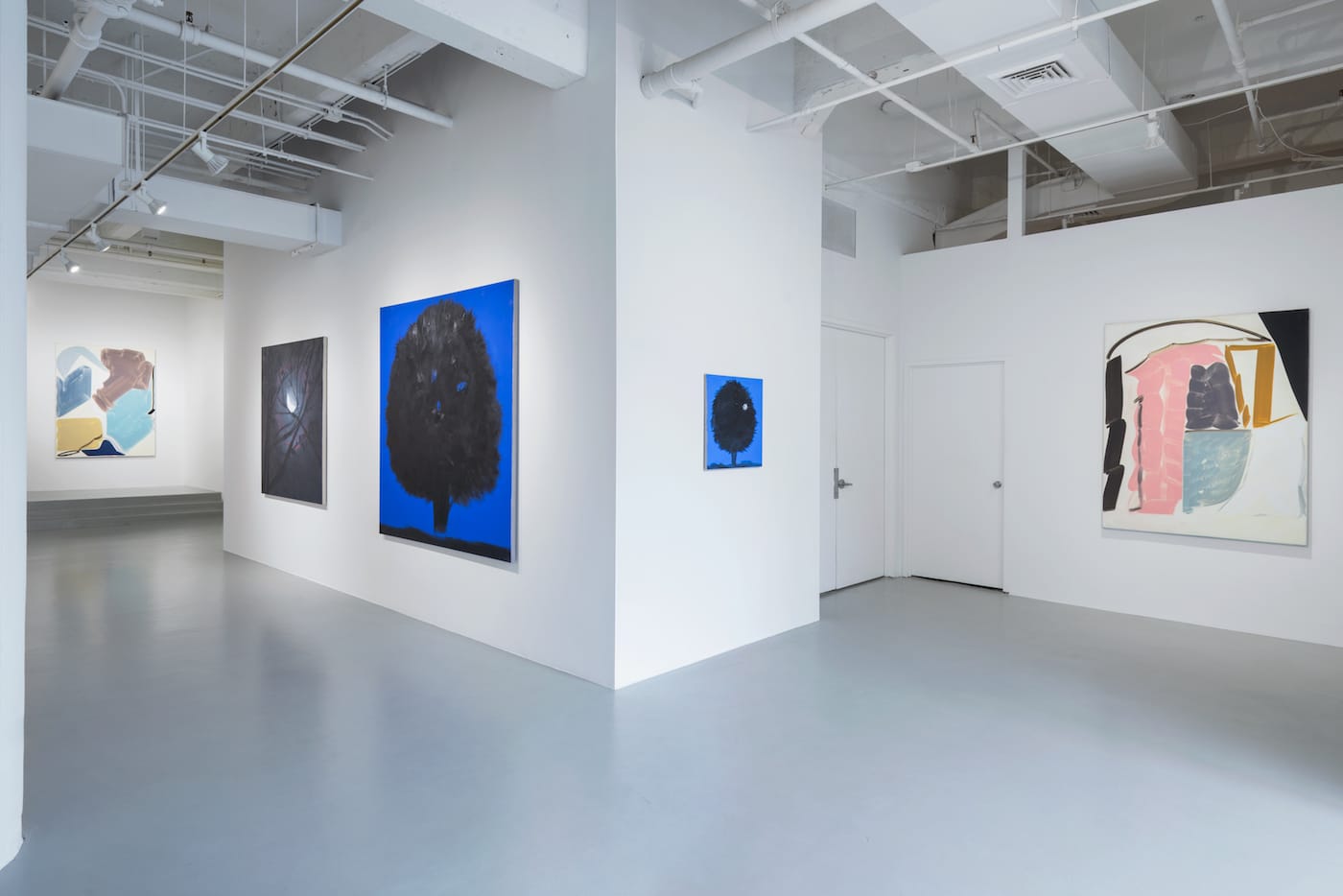 In a show that’s predominately focused on abstract paintings, Ann Craven’s work offers a contrasting perspective. All three of her works are high gloss and involve trees. “Tree (Purple Beech, Cushing, 8-22-13, 10PM)” (2013) seems to fit the dialogue created by the other paintings in the show. The tree in this picture is like a large, dark mass coming out of the surface of the painting. In the upper right portion of the circular mass of limbs and leaves, a bit of blue breaks through, adding some variation to the coloring. Craven inserts some surreal humor with a trunk that’s disconnected from the ground. Perhaps it’s the inclusion of the moon in the other two paintings, but they would make more sense as part of another conversation.