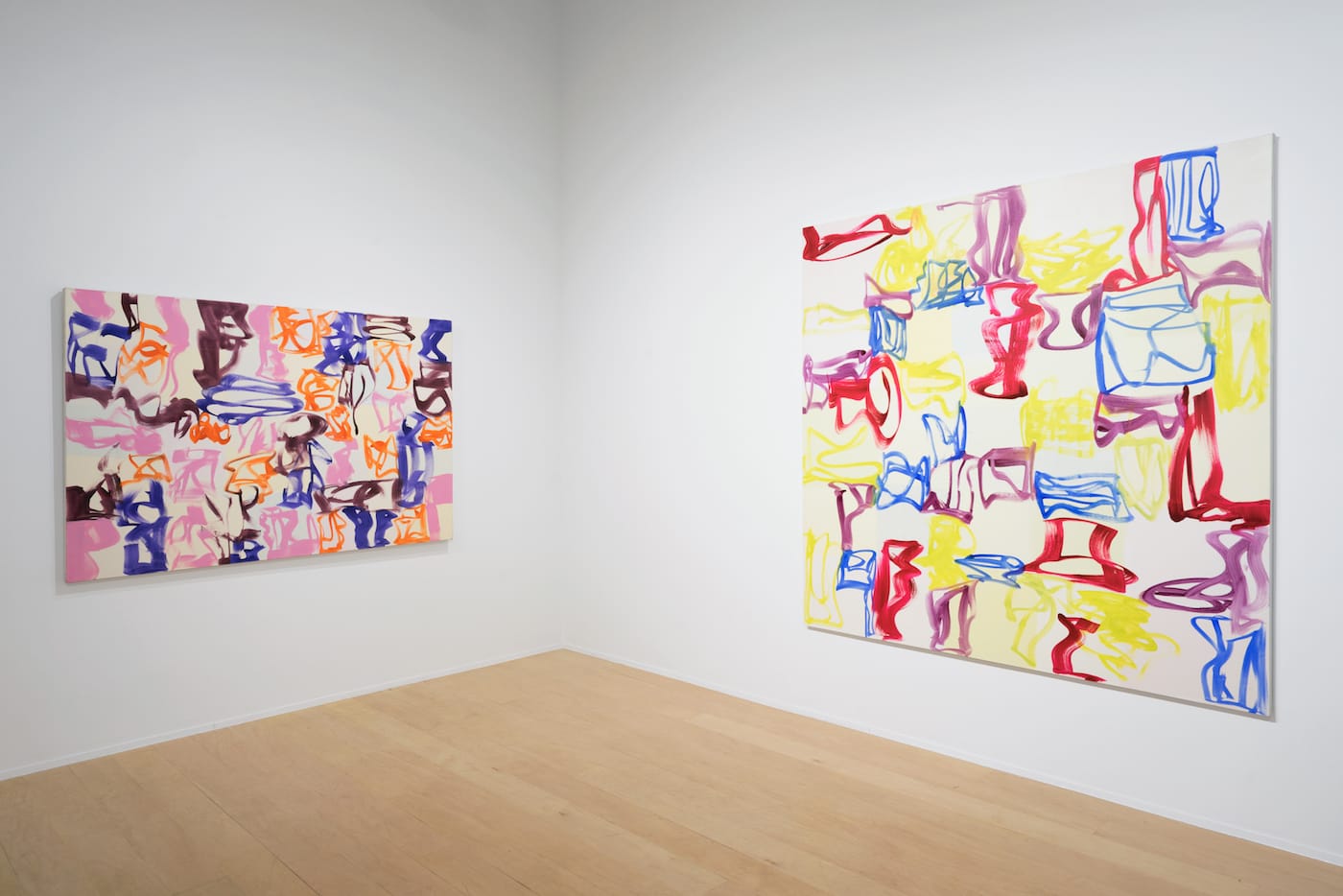 Like Treib’s brush strokes, Melissa Meyer’s paintings, reminiscent of 1980s subway graffiti, reflect the body’s movement during the creation of the painting. Meyer paints on the floor and works in oil thinned to the consistency of watercolor. There are no clumps of paint that could slow the eye down as it moves across the work. The title and contrast between the purple, black, and white in “Draw the Line” (2015) emphasize the clusters of movement on the canvas.